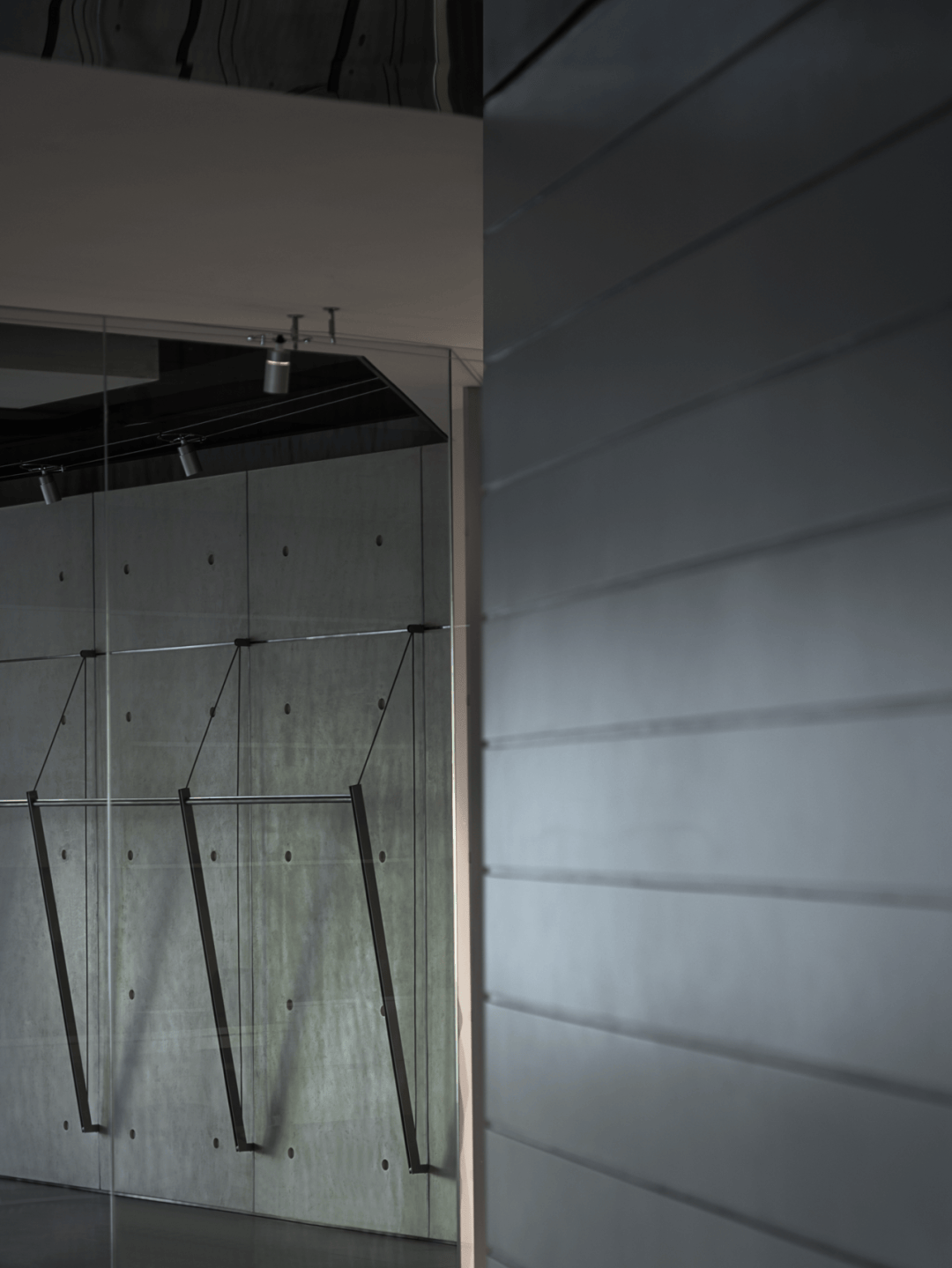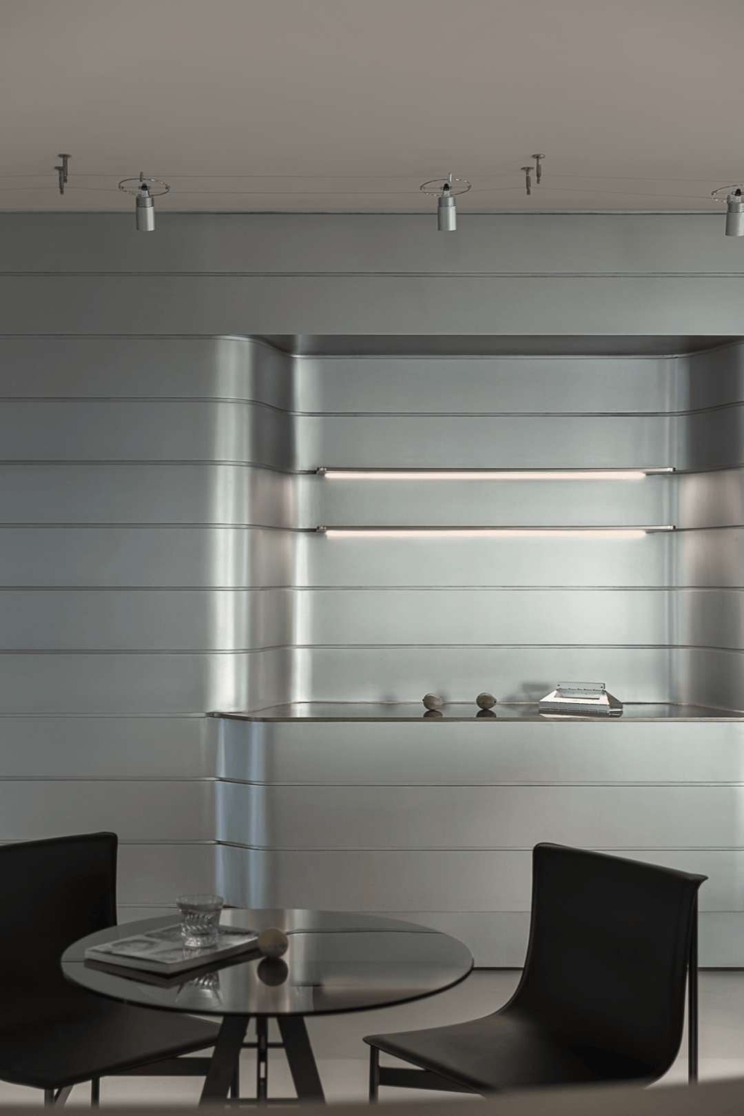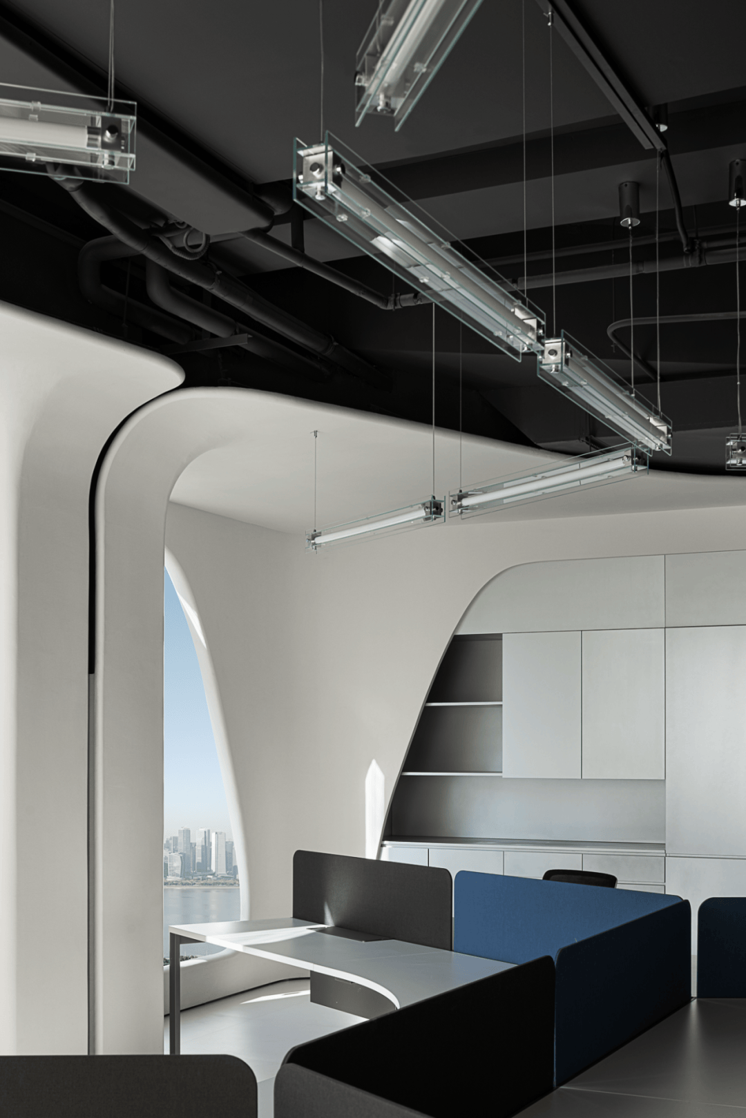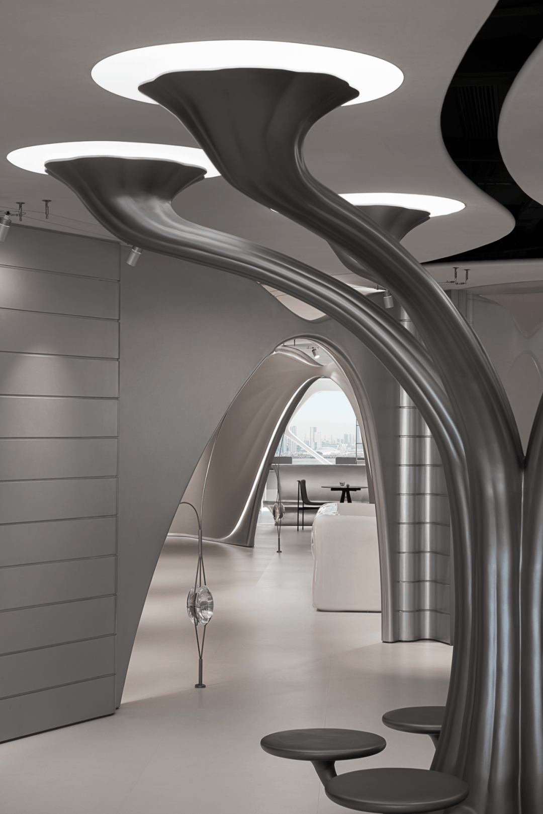 视觉:弧形墙面采用渐变喷涂,从白色过渡到浅灰,形成空间深度暗示