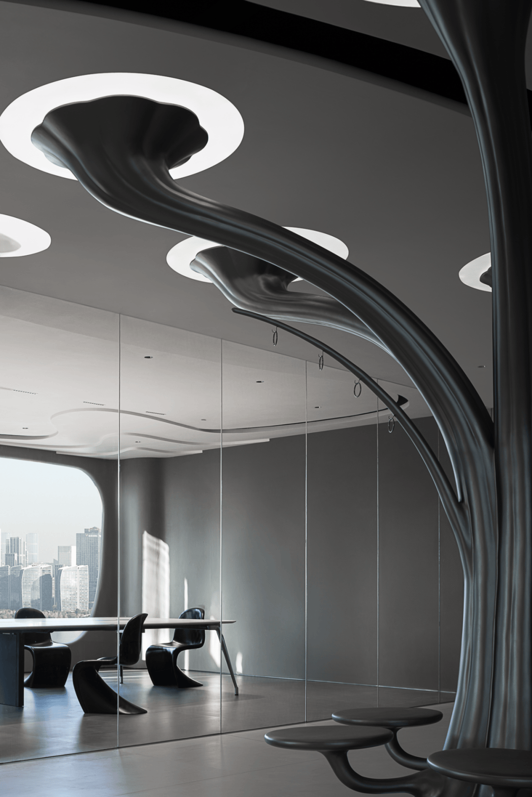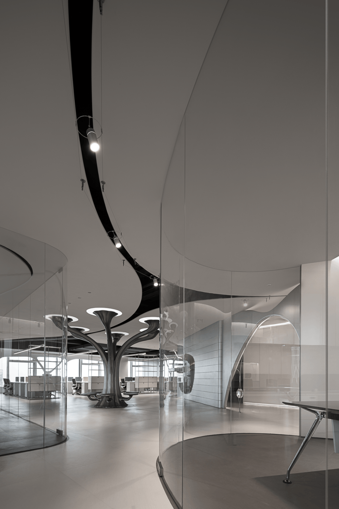 水纹玻璃:在会议室隔断使用3D打印玻璃,其表面波纹可折射光线形成动态光影效果