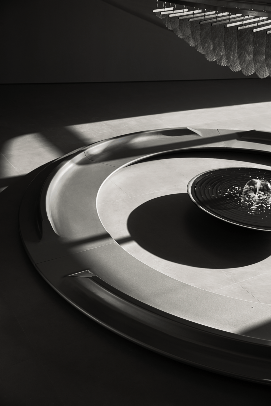 中央水庭:直径8米的圆形水池底部嵌入128组可调色LED灯,通过程序控制模拟潮汐运动