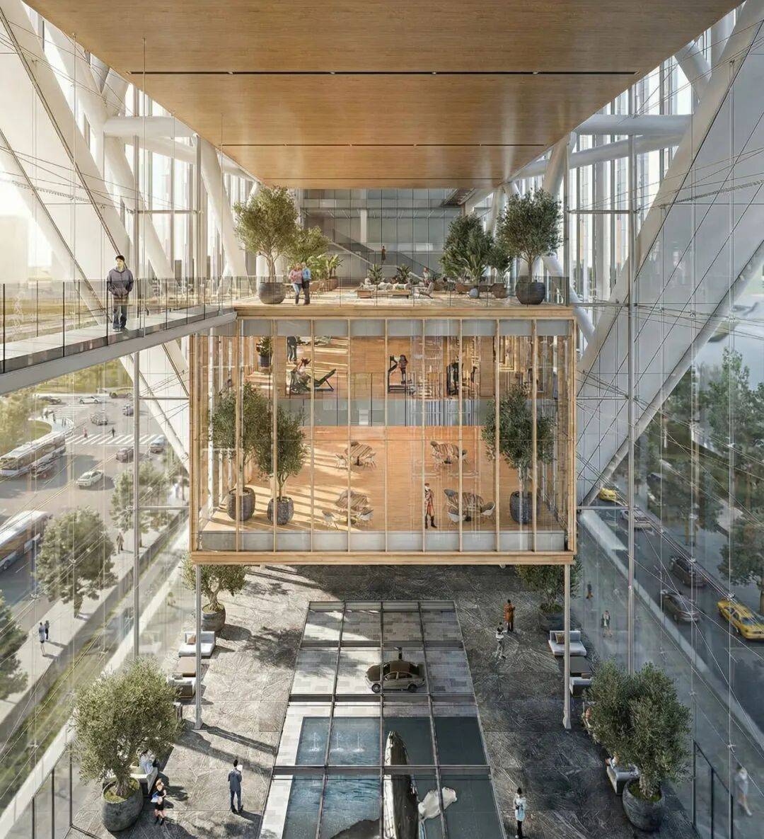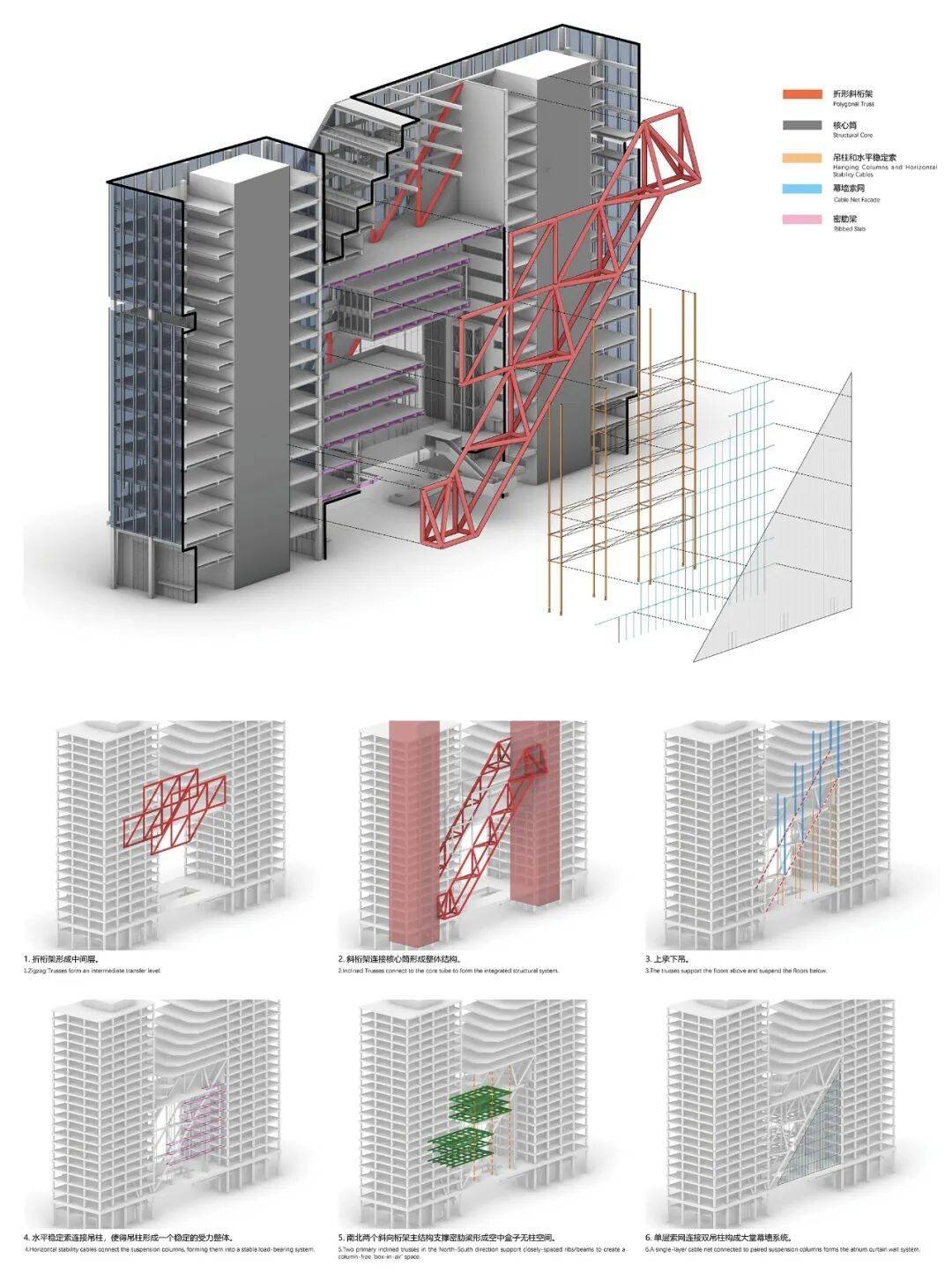 跨层悬吊体系:桁架跨度达58米,悬挑长度12米,创造无柱办公空间
