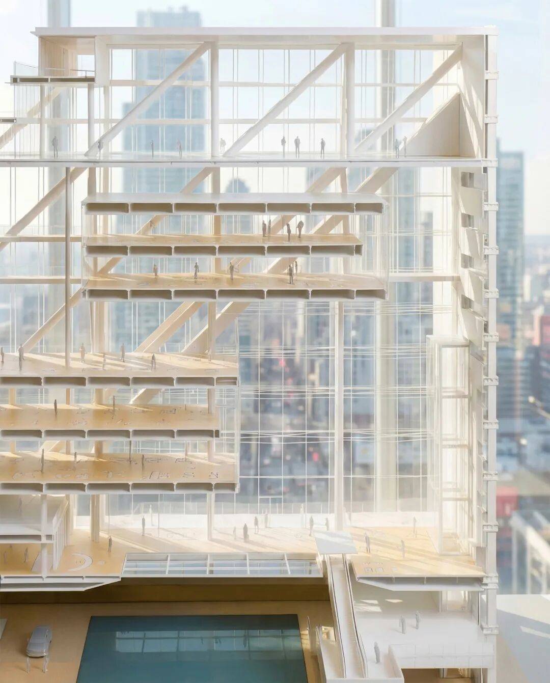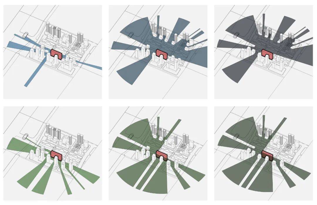 水平交通:设置3条空中连廊,连接南北塔楼,宽度从4.5米渐变至7.2米