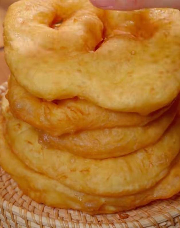 关键:面糊稀一点更蓬松,炸时用筷子按压油饼中心。