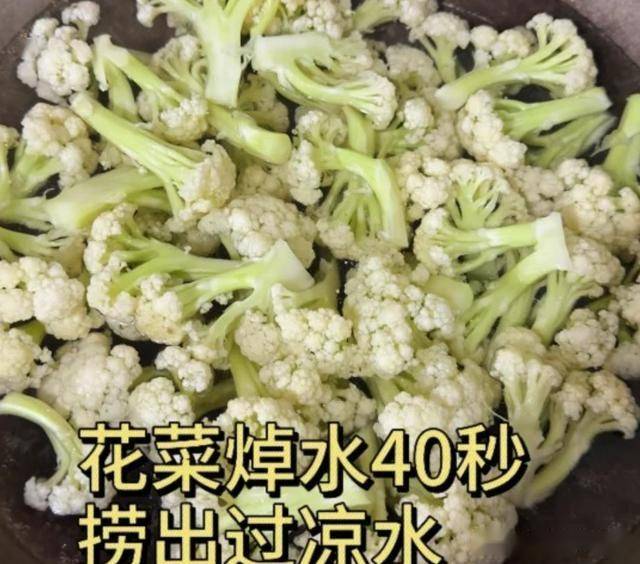 花菜切小朵,别太大。烧一锅开水,水里加一勺盐,把花菜丢进去焯水。注意!只焯1分钟左右,看到花菜变色、边缘有点透明就赶紧捞出来过凉水。这一步是为了让花菜保持脆感,等下炒的时候不容易焦,也更容易吸味。