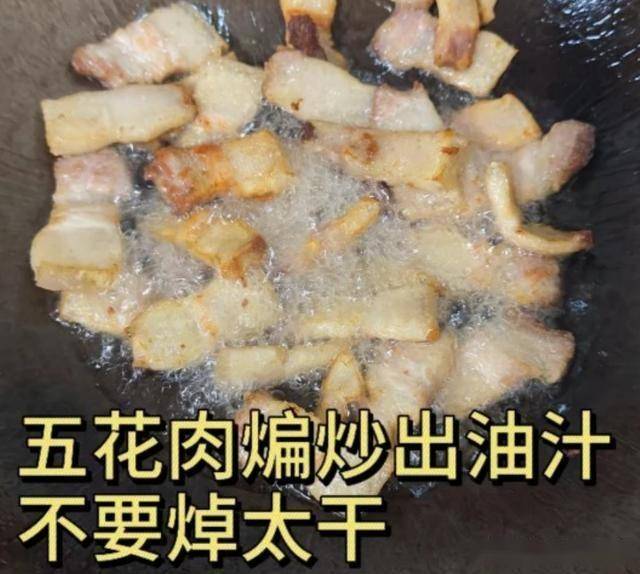 五花肉切薄片(稍微冻一下更好切)。锅烧热,不用放油! 直接把五花肉片丢进去,中小火煸炒。