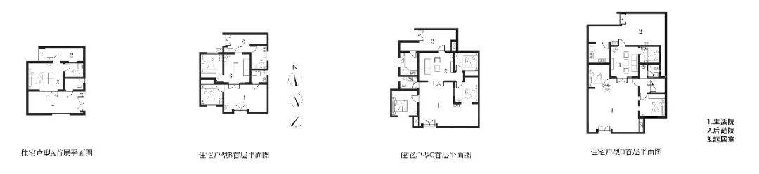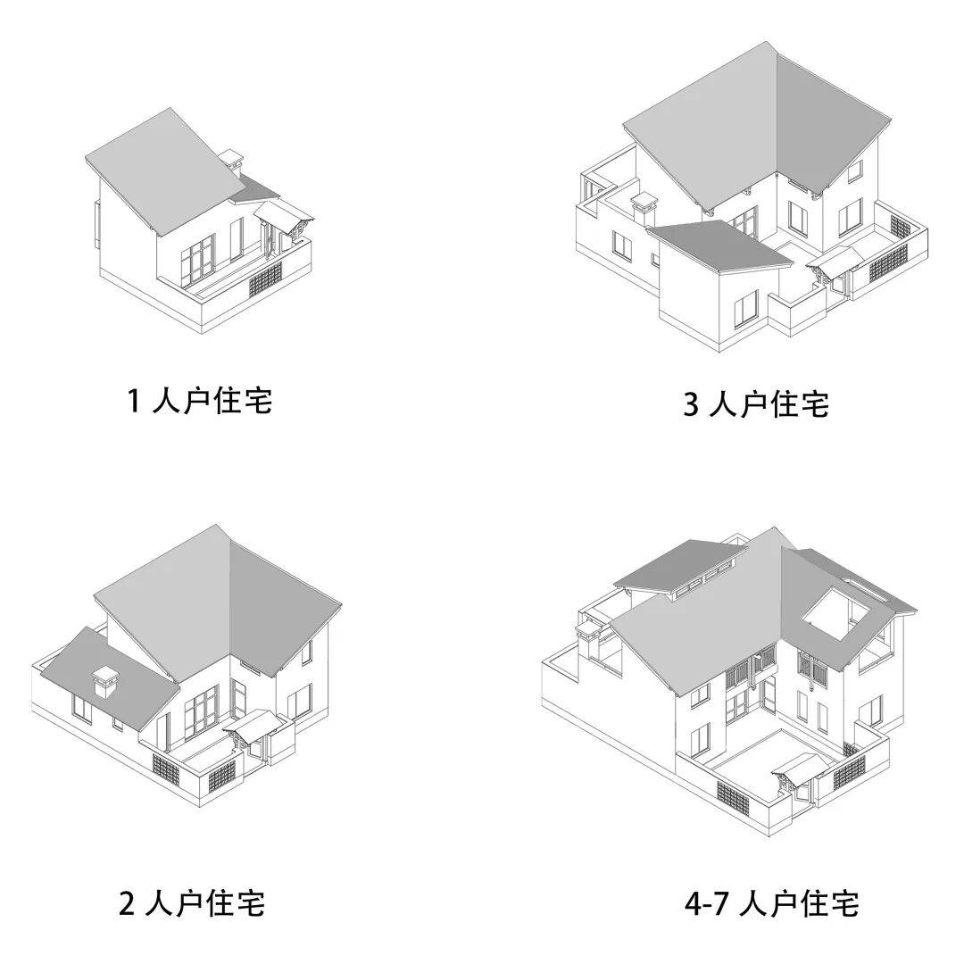 设计4个独栋户型,满足1-3人户(25㎡/人)与4-7人户(100㎡/户)需求,采用前后院布局:前院为生活性庭院,后院为生产性庭院。