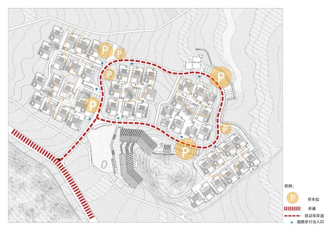 采用“环形车行+人车分流”模式,环状车行主道连接5个组团与社区中心,组团内部为步行空间,既满足停车需求,又提升步行安全性与舒适度。