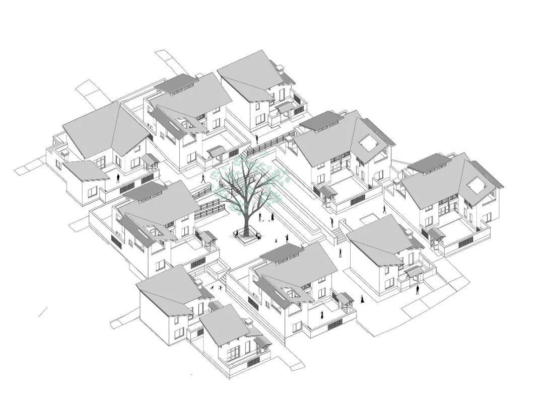 设计提出“行政村—村民小组—组团”三级体系,相邻组团间留设6-12米绿廊,由住户种植形成乡土农业景观,既保留传统空间逻辑,又适应现代开放社区需求。