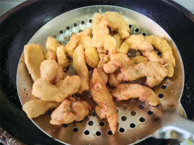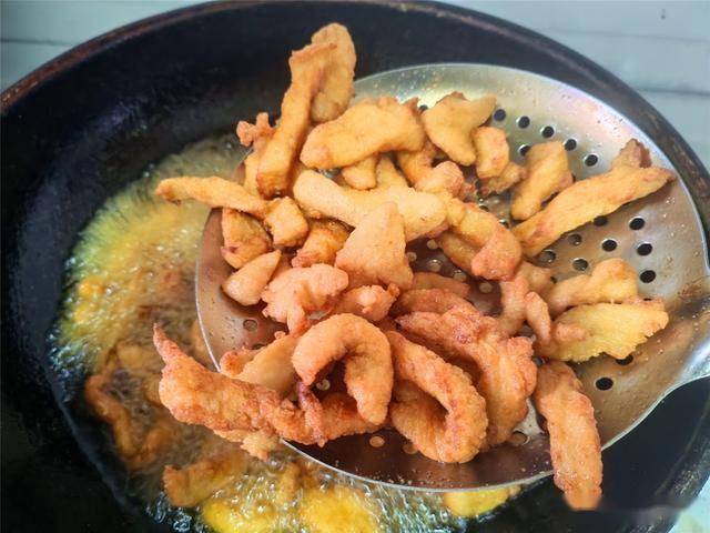 6.锅中倒入适量油,油量要能没过鸡柳。开中火加热,怎么判断油温合适呢?可以放一条鸡柳进去,如果鸡柳周围迅速冒起密集的小气泡,说明油温正好!油温合适后,将鸡柳一条条放入锅中,中小火慢炸。用筷子轻轻翻动,让每一面都受热均匀,把鸡柳炸熟,炸至表面浅黄,捞出沥干油分。
