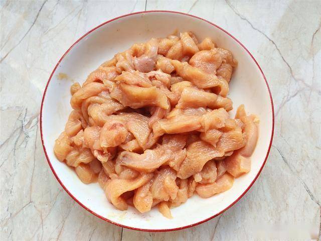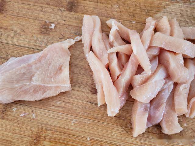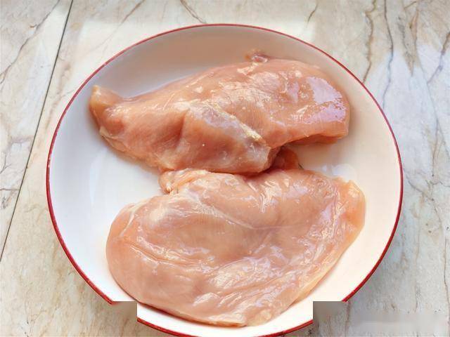 1.鸡胸肉洗净,切去鸡胸肉的筋膜和鸡油。
