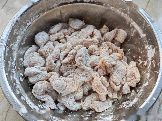5.把腌制好的鸡柳放在盆内,分次加入玉米淀粉,用手从下往上翻拌鸡柳,让每一条鸡柳都均匀地沾上一层淀粉,抖掉多余的粉。