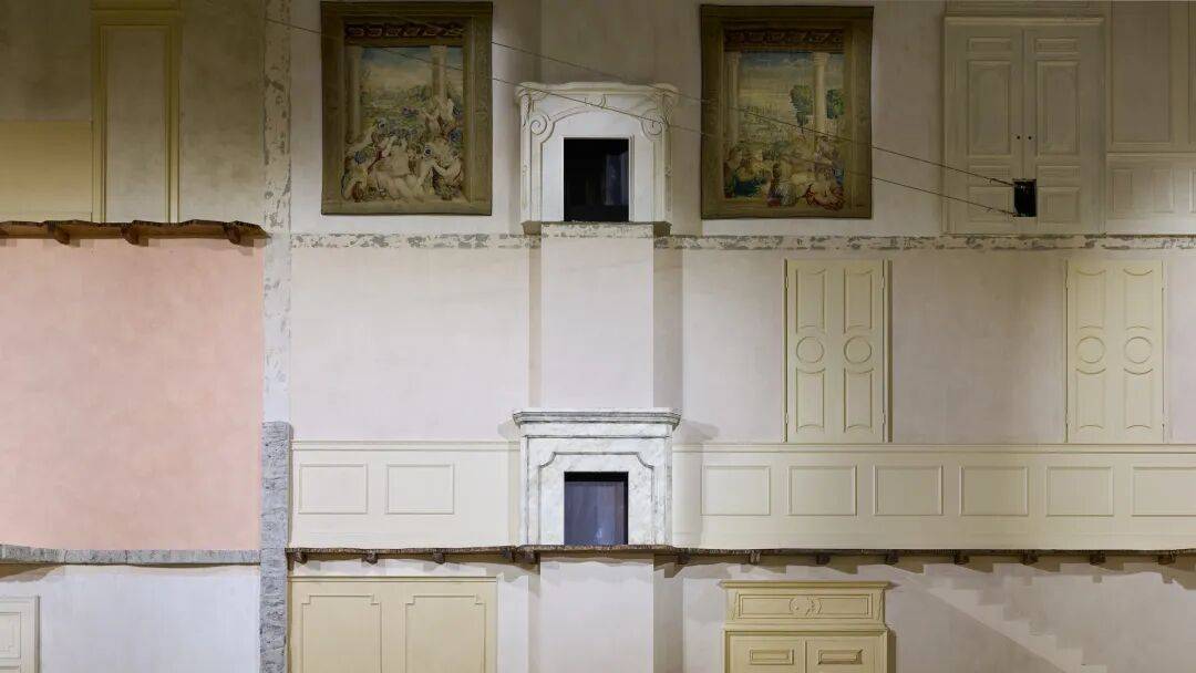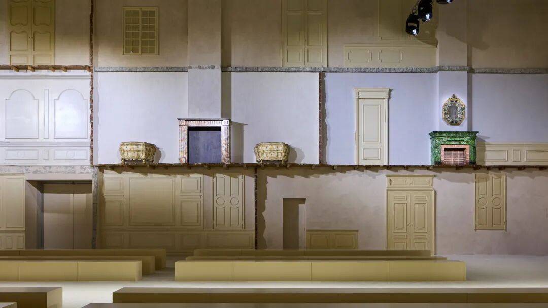 空间内部陈列来自不同年代的艺术品与家具,16至17世纪的挂毯与绘画、18世纪的威尼斯镜面与桌案,以及20世纪的座椅与灯具。跨越五个世纪的物件被散置在秀场之中,使秀场看起来既像一座私人收藏空间,又仿佛一座被时间不断叠加的历史宅邸。