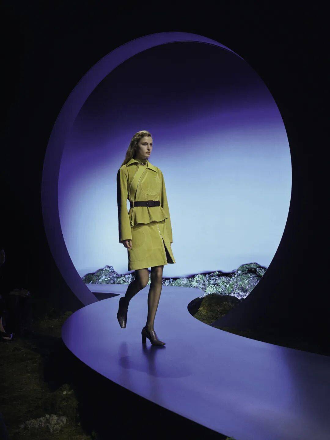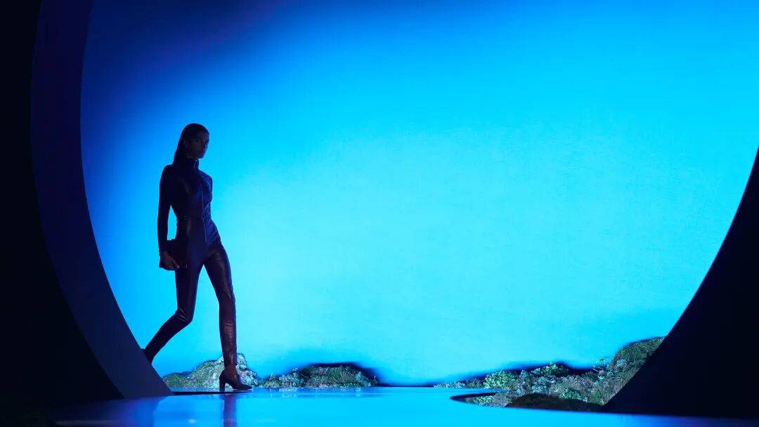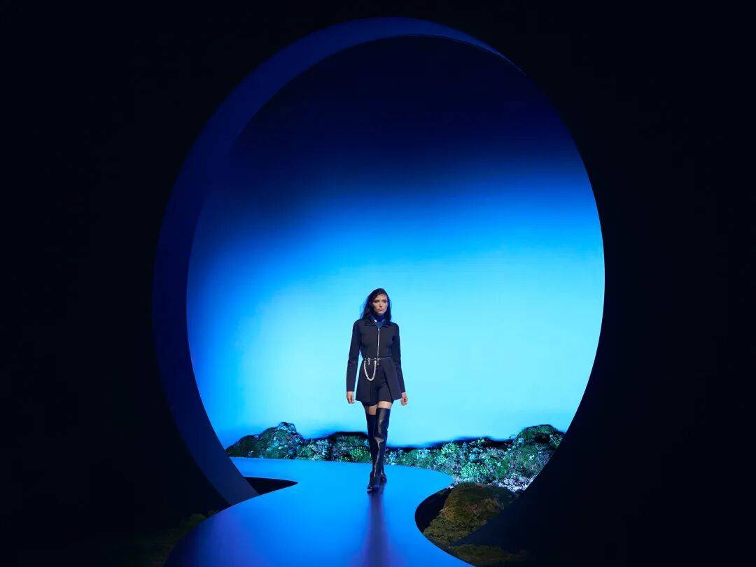 光影与材质成为本季秀场营造沉浸式体验的关键元素。Hermès在La Garde Républicaine的暮光秀场中,以蓝色调跑道、苔藓植被与发光圆形装置,构建了一个介于日与夜之间的世界。光线在空间中不断变化,使服装的结构与材质在流动中呈现雕塑般的体量感。这种设计放慢了观看节奏,让服装在移动中被重新感知。