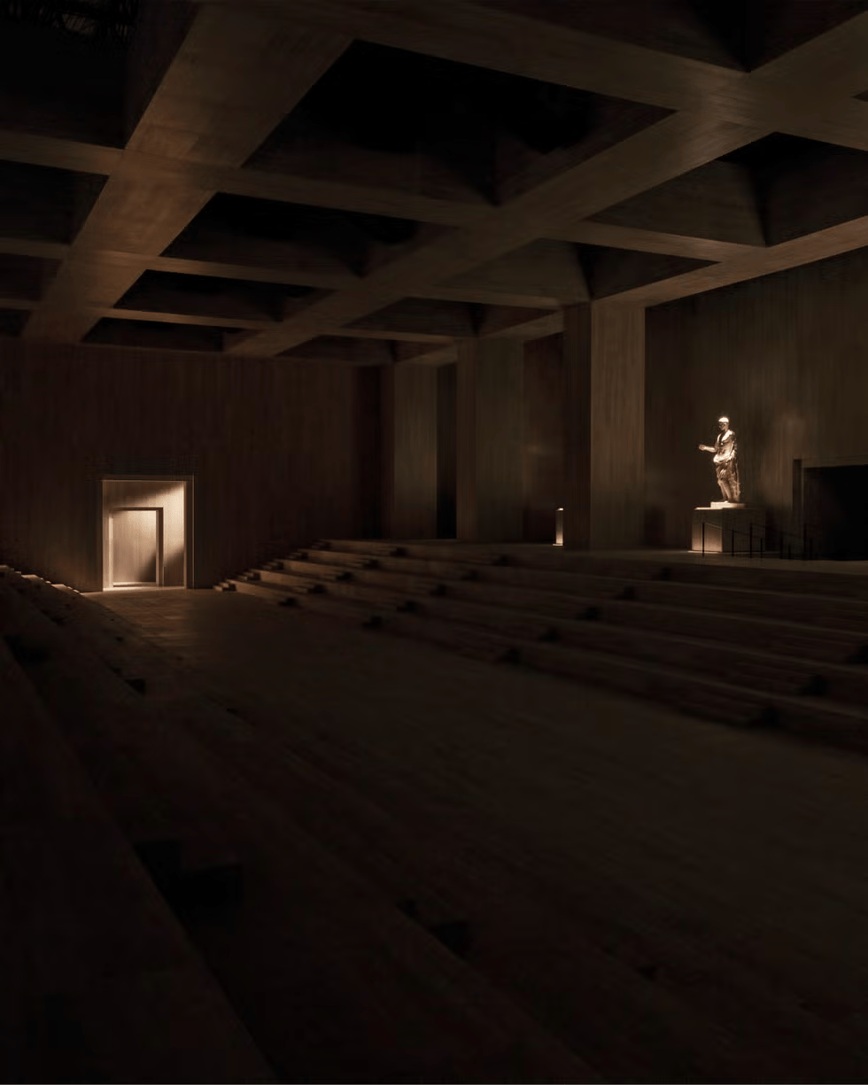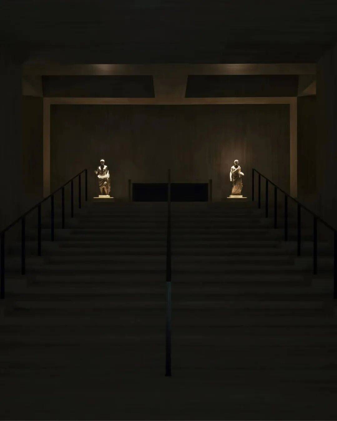 这座充满工业记忆的场馆这一次被重新构想为一座“博物馆”。观众进入空间后,首先映入眼帘的是一间被浅色洞石包覆的宏大大厅。墙面与结构表面采用StoneLeaf制作的柔性洞石板材,这种将天然意大利大理石薄片附着于树脂与玻璃纤维上的材料,在保留石材质感的同时减轻了重量,使整个空间呈现出一种看似厚重却轻盈的建筑表情。在这座临时博物馆中,一系列古典雕塑散布其间。作品以佛罗伦萨Uffizi美术馆与那不勒斯国家考古博物馆收藏为原型,通过3D扫描技术复制,并由托斯卡纳工匠以石膏重新制作,再经处理呈现出仿若大理石的质感。