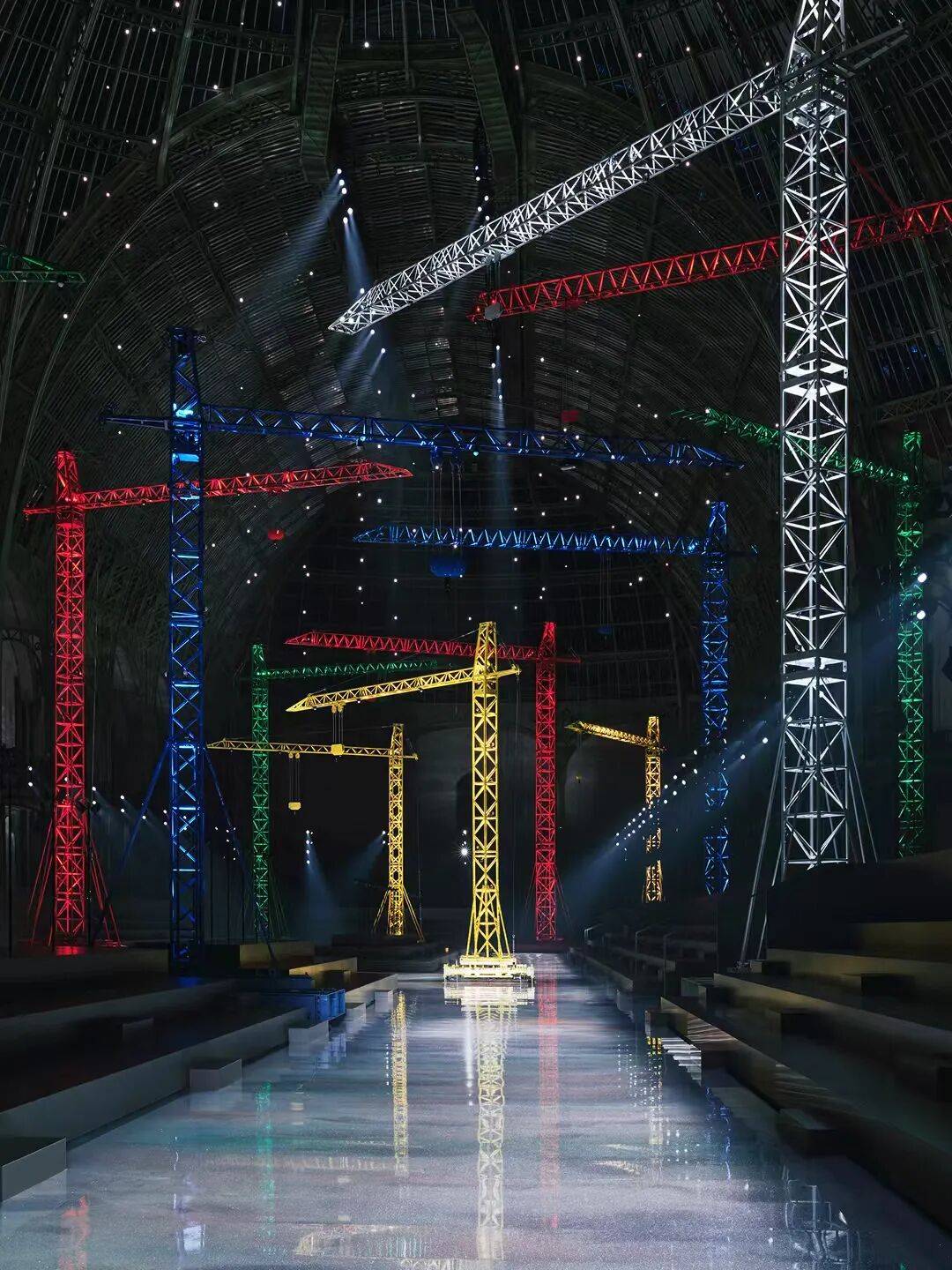 在创意总监Matthieu Blazy的第二个成衣系列中,这座历史空间被重新构想为一处充满活力的“建筑工地”。闪耀的颗粒地面铺展开来,如同一片舞台般的银色平面,而数座巨型起重机装置矗立其间。它们以红、蓝、黄等原色呈现,既像童话城市中的玩具机械,也仿佛一处正在建造中的时尚现场。