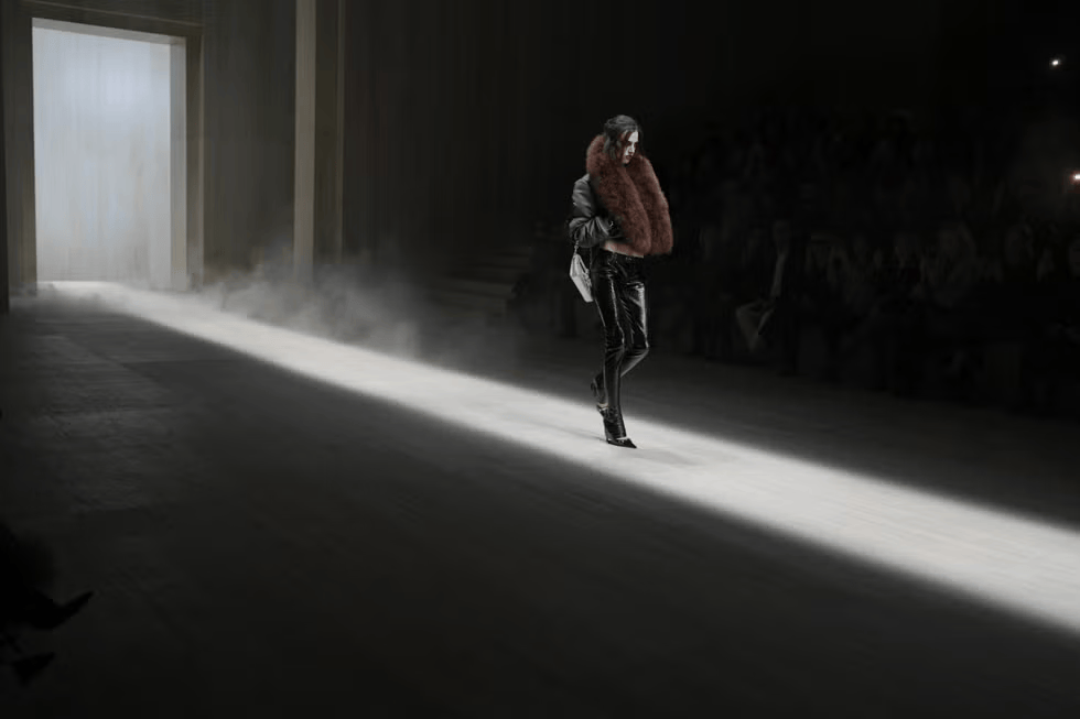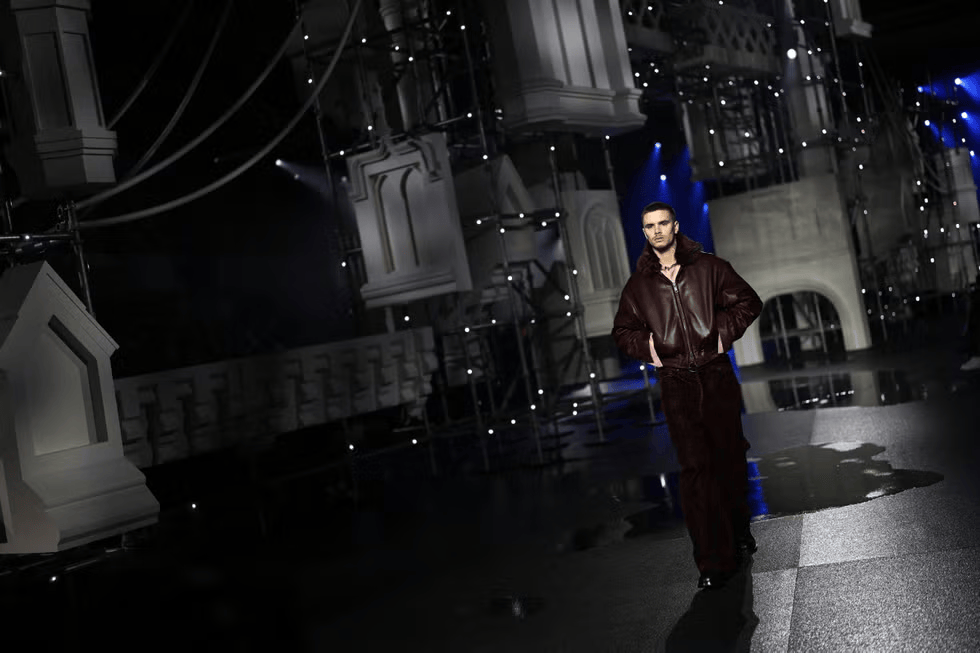 这种光影策略呼应了本季系列所强调的明暗对照,在不断变化的灯光之下,服装的结构与材质逐渐显现,又重新融入阴影之中。硬朗剪裁的西装、马术灵感的裤装与柔和的A字轮廓在光线流动中呈现出雕塑般的体量感。