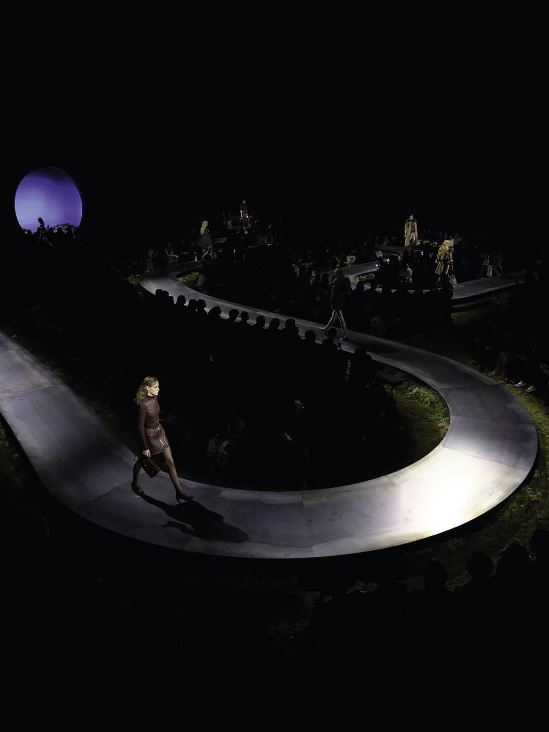 秀场尽头,一道发光的圆形装置悬挂于空间之中,如同远方的月亮或一道通往另一片景象的入口。模特从这一光环中走出,随后进入曲折的路径,形成一种近乎电影场景般的仪式感。光线在空间中不断变化:温暖色调仿佛日落最后的余晖,而冷蓝色灯光则暗示夜色渐深。