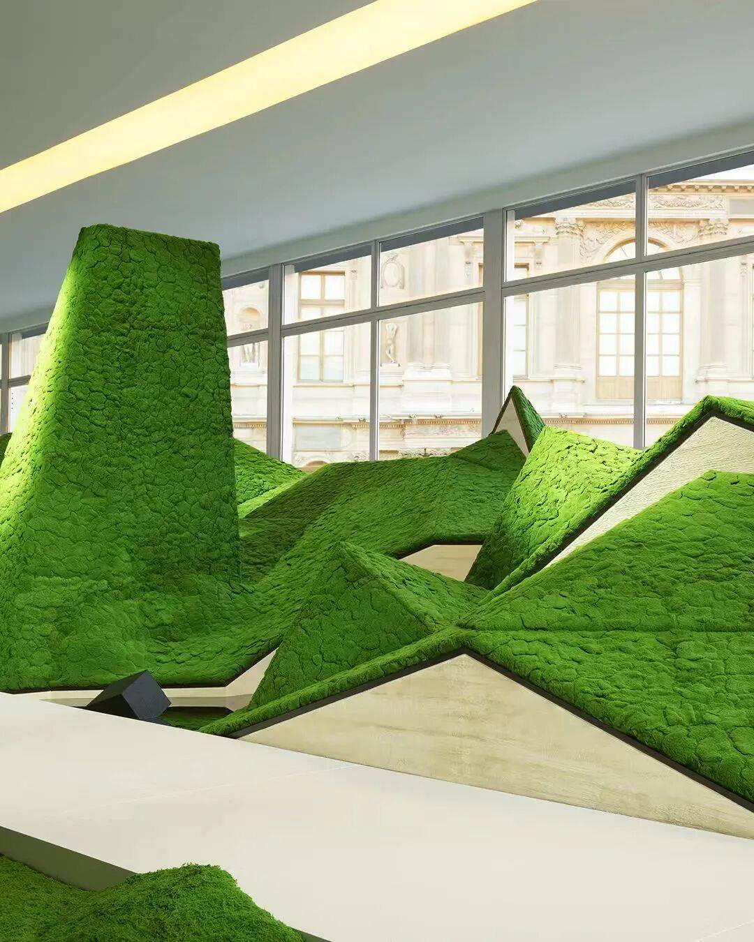 在卢浮宫古典石墙围合的庭院中央,一座临时搭建的透明结构形成半室内展示空间。观众沿楼梯进入其中,面对的是一片由绿色雕塑构成的抽象地景。起伏的山丘被切割成尖锐棱角,形成类似未来山脉的结构,与庭院四周文艺复兴时期的建筑立面形成鲜明对比。简化后的体块在灯光下投射出强烈阴影,使整个场景更像一座雕塑化的景观模型。