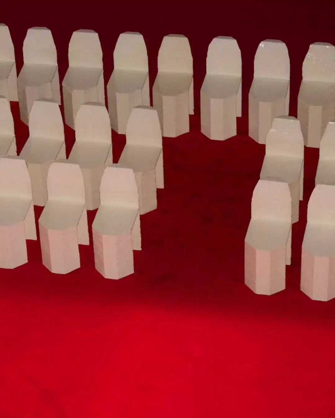 在这一克制而宏大的建筑空间中,创意总监Louise Trotter将秀场叙事的重心放在“座椅”这一日常物件之上。她邀请英国设计师Max Lamb为本次大秀特别创作421把手工椅子,让观众席本身成为秀场空间的重要组成部分。这些椅子由聚苯乙烯与聚氨酯手工塑形而成,延续了Max Lamb在其设计项目60 Chairs中探索的材料实验。粗粝的表面保留了切割与雕刻的痕迹,呈现出近乎原始的雕塑质感。未经着色的乳白色椅子与秀场铺陈的深红地毯、猩红漆面柱体形成鲜明对比,在剧院式中庭内构建出一种极具张力的视觉场景,也强化了Trotter在秀场笔记中所提到的主题:关于“集体表达”的想象:心灵、思考与手工之间的协作关系。