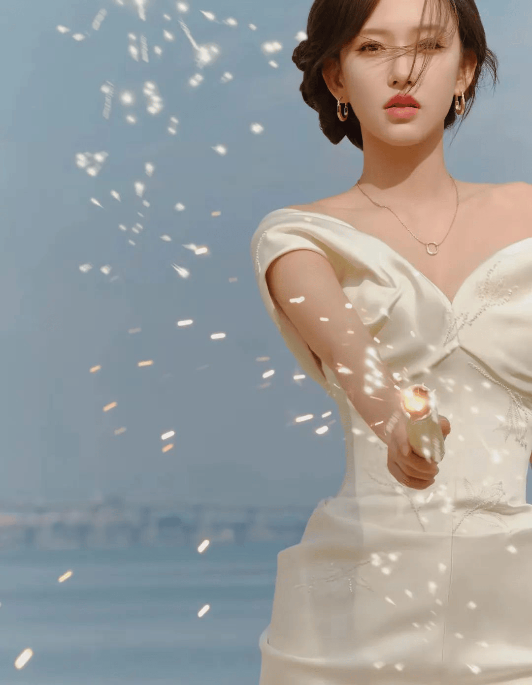 程潇的这组浪漫唯美写真,仿佛将人带入一个氤氲着水汽的仲夏夜之梦。她置身于一片朦胧的暖光与纷飞的花瓣中,身着一袭薄纱质地的长裙,裙摆如水波般漾开。她没有直视镜头,而是微微仰头闭目,任由人造雨丝轻柔地落在她的脸颊与睫毛上,水珠晶莹,与她恬静的神情交织,营造出一种介于真实与幻境之间的极致浪漫。