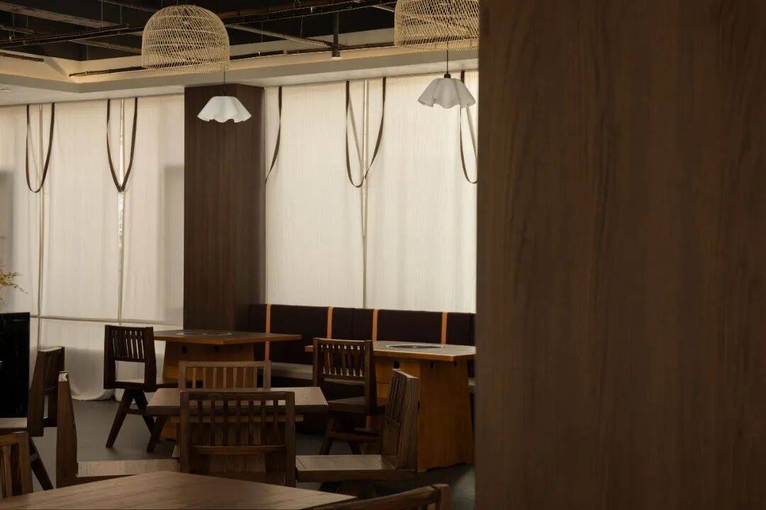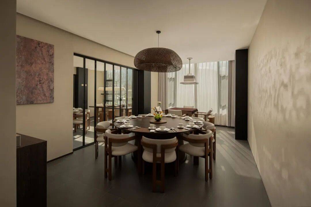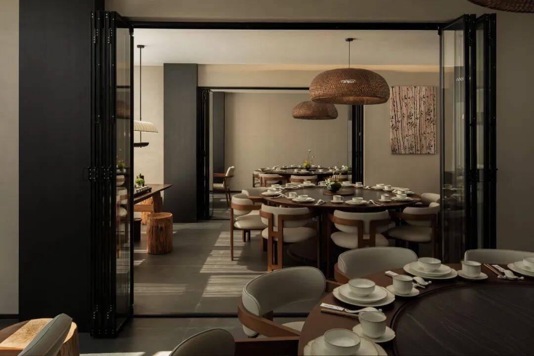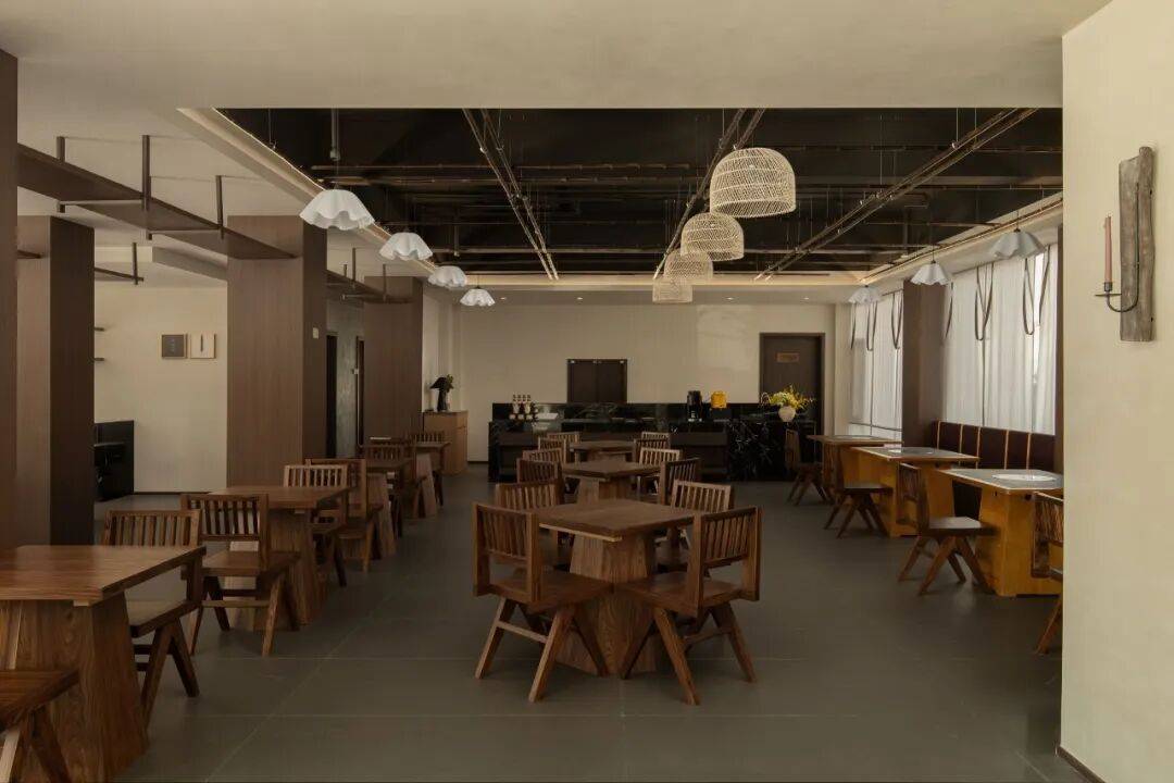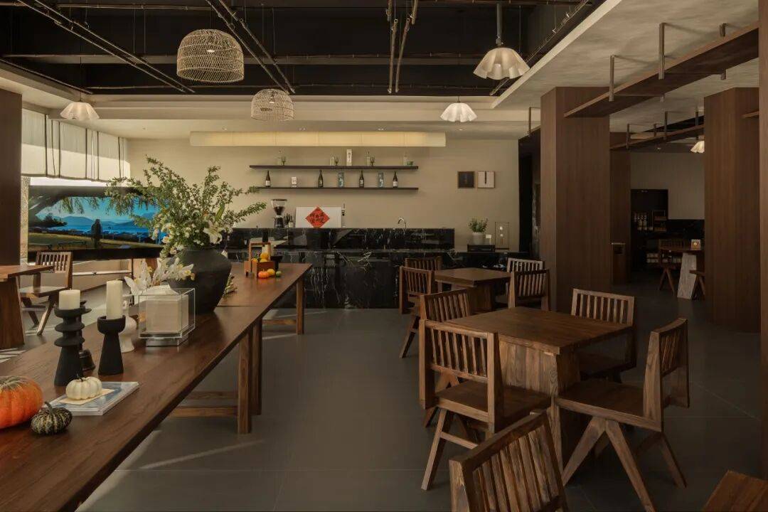 餐厅与咖啡吧区域延续了整体风格,却多了几分烟火气息。餐厅区域以大量木质家具和藤编吊灯营造出度假的轻松感。中间的长条桌功能灵活:平日作为特色产品展示,活动时则化身为社交核心区。顶面的管线处理是设计团队的小心思——用竹制穿线管代替传统的PVC或金属线管,这一细节极大地提升了空间的“野奢”质感。