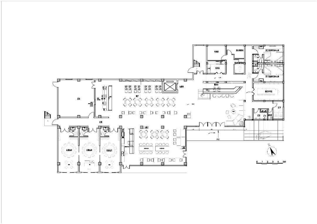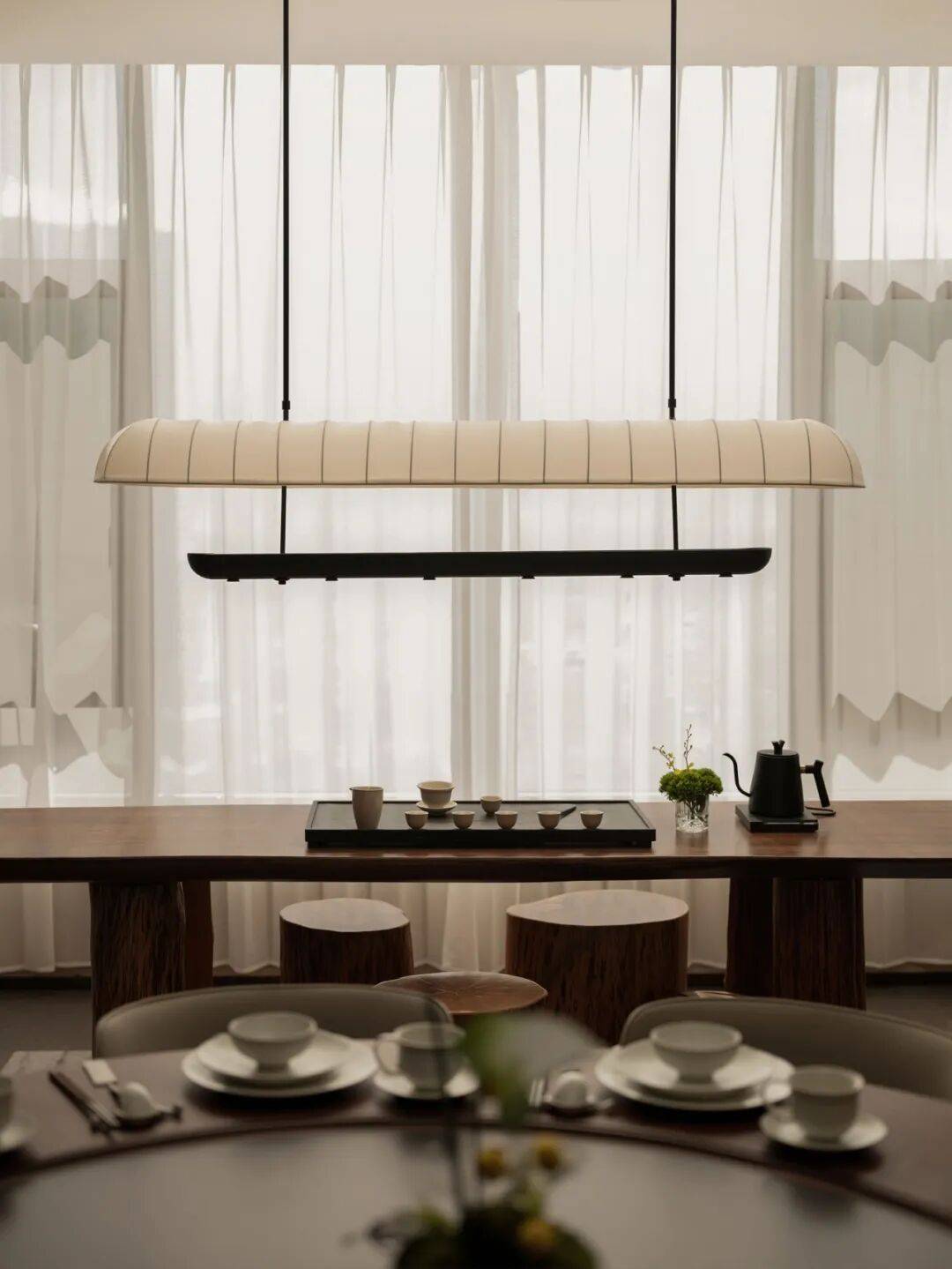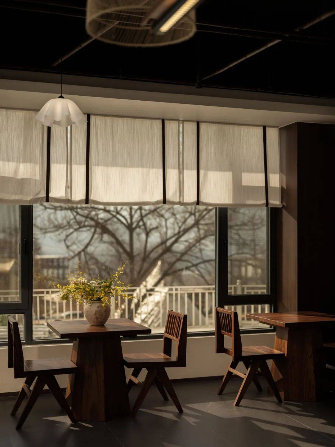 餐厅与咖啡吧区域延续了整体风格,却多了几分烟火气息。餐厅区域以大量木质家具和藤编吊灯营造出度假的轻松感。中间的长条桌功能灵活:平日作为特色产品展示,活动时则化身为社交核心区。顶面的管线处理是设计团队的小心思——用竹制穿线管代替传统的PVC或金属线管,这一细节极大地提升了空间的“野奢”质感。