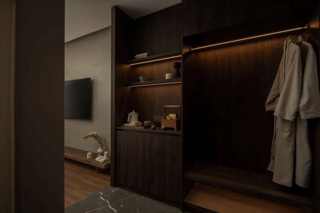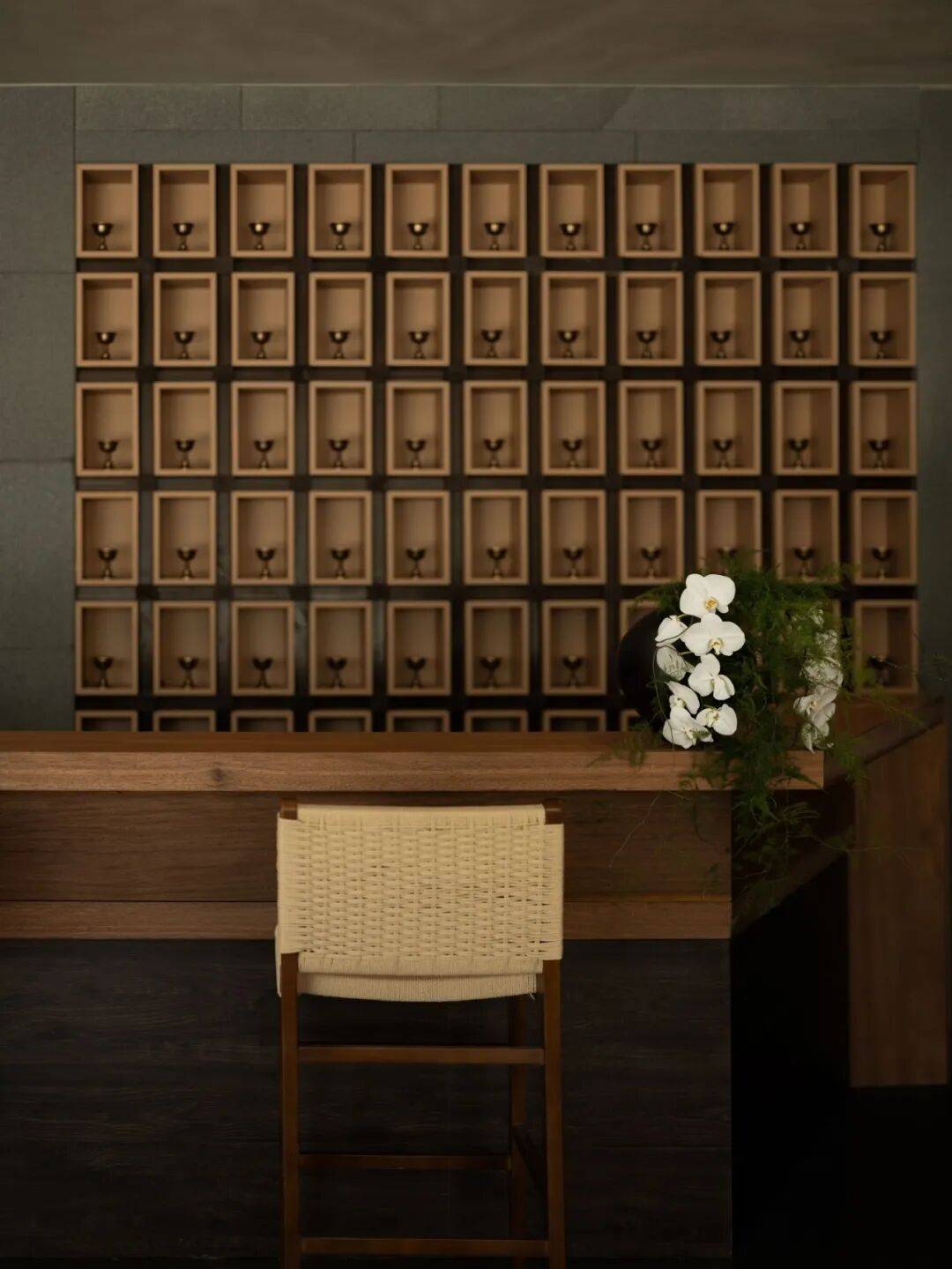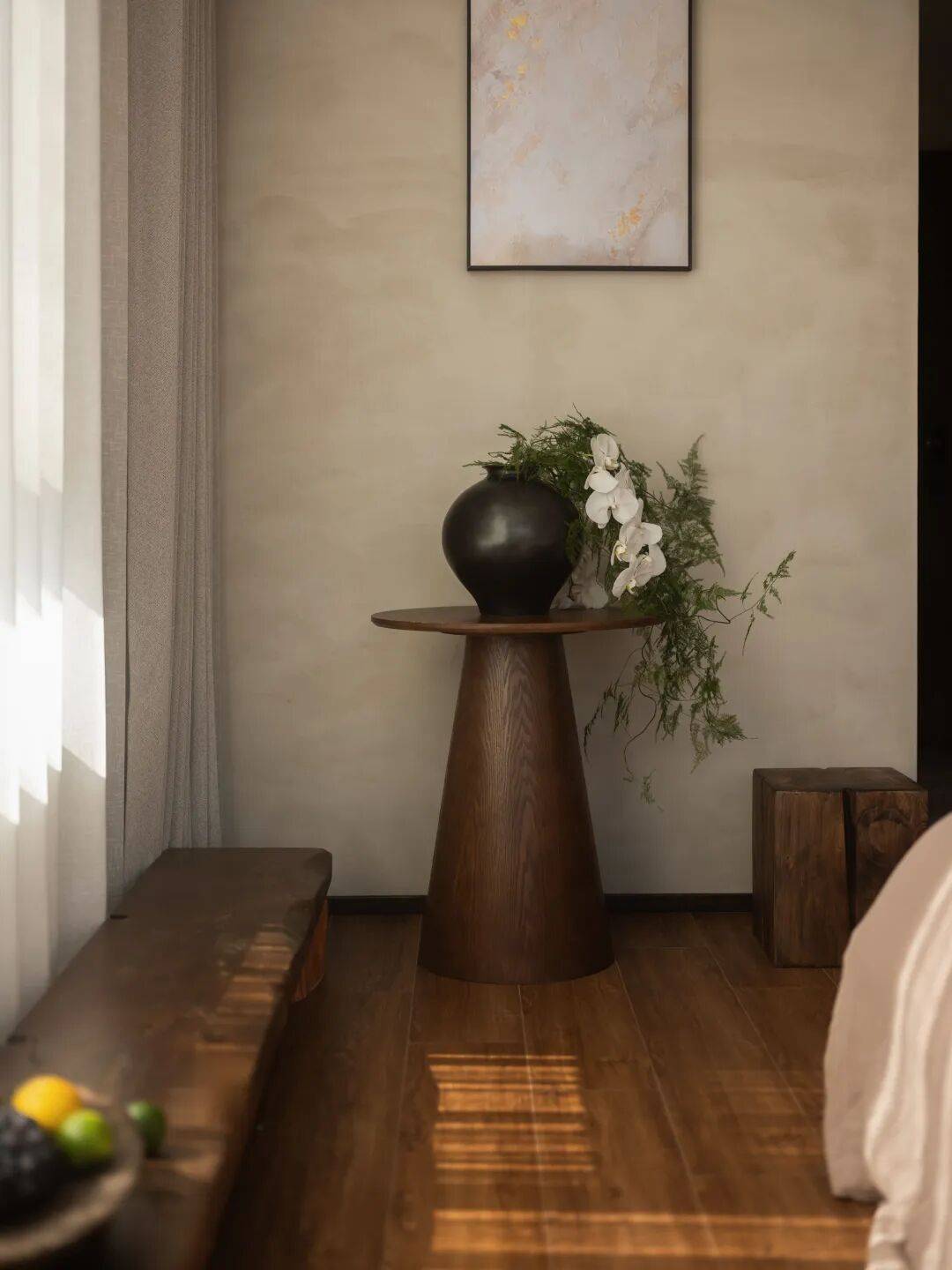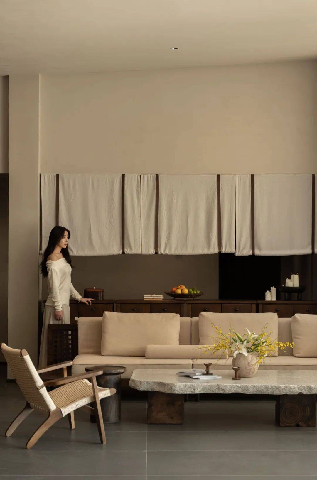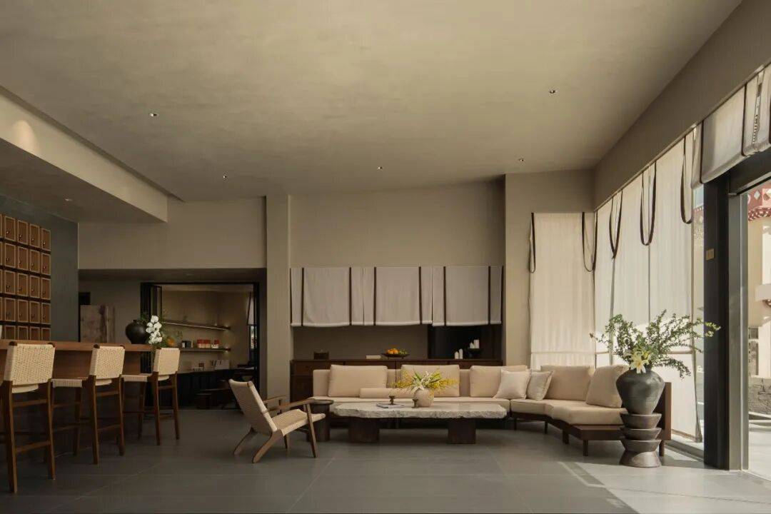 大堂的设计是整个设计的核心,不仅仅是一个通过空间,更是一次精神的洗礼。地面铺陈灰黑色的仿石砖,奠定了沉稳的基调。墙面大量运用了微水泥与胡桃木的搭配,冷峻与温润在此调和。休息区的座椅是当地浅色绳编工艺与木艺的结合,充满了手工的温度;茶几则由当地特色石材手工打磨而成,保留了自然的粗粝感。