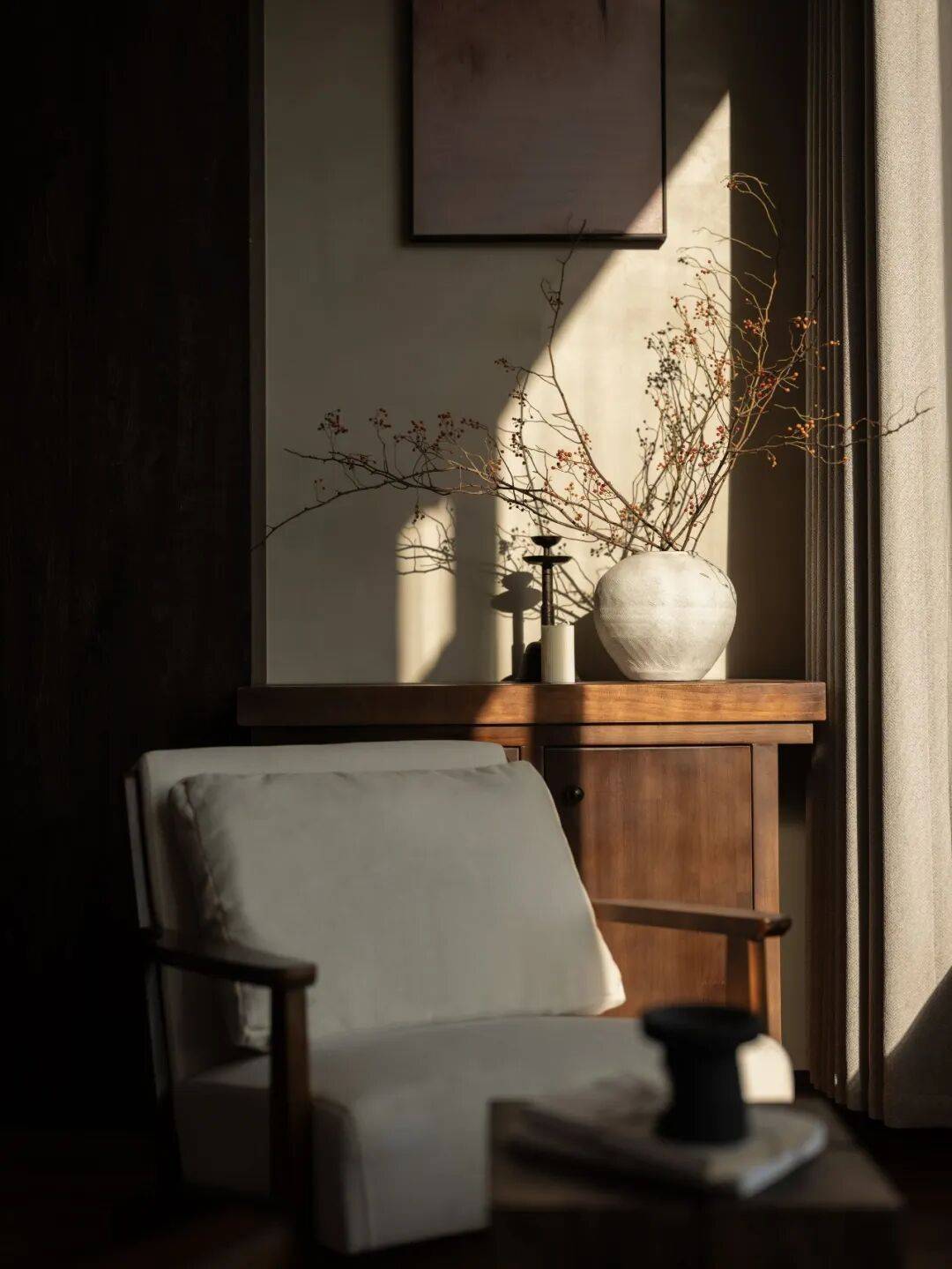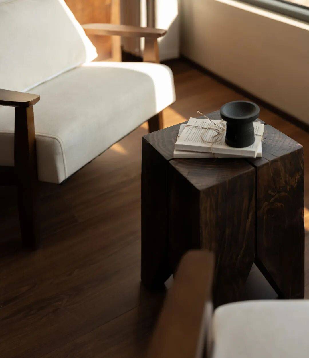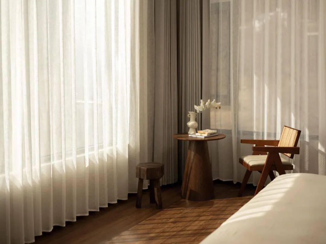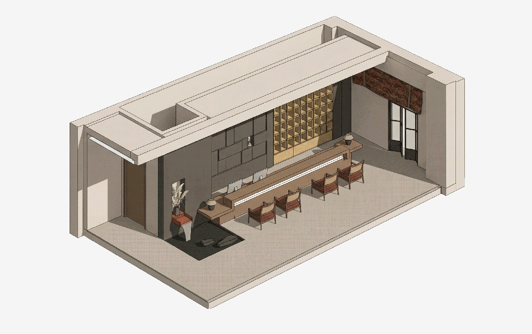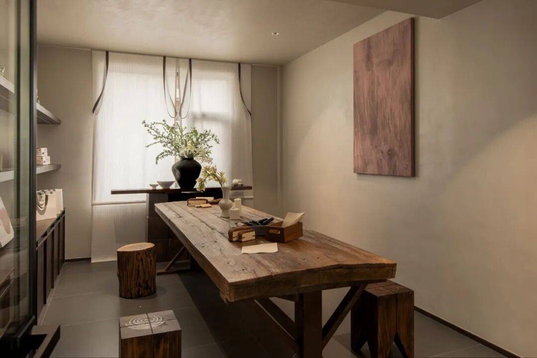 大堂的设计是整个设计的核心,不仅仅是一个通过空间,更是一次精神的洗礼。地面铺陈灰黑色的仿石砖,奠定了沉稳的基调。墙面大量运用了微水泥与胡桃木的搭配,冷峻与温润在此调和。休息区的座椅是当地浅色绳编工艺与木艺的结合,充满了手工的温度;茶几则由当地特色石材手工打磨而成,保留了自然的粗粝感。