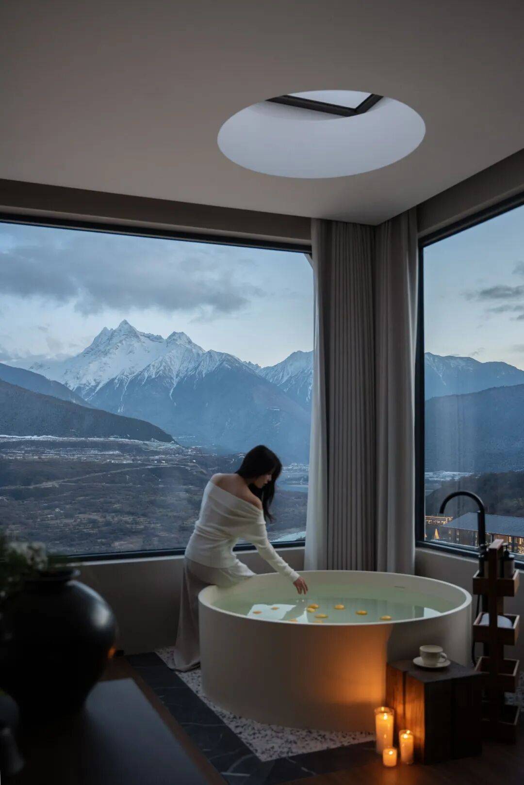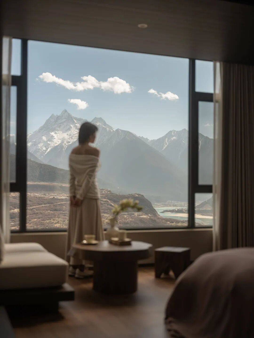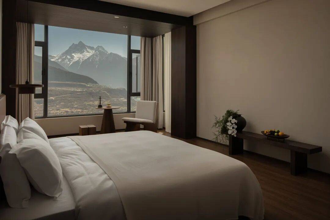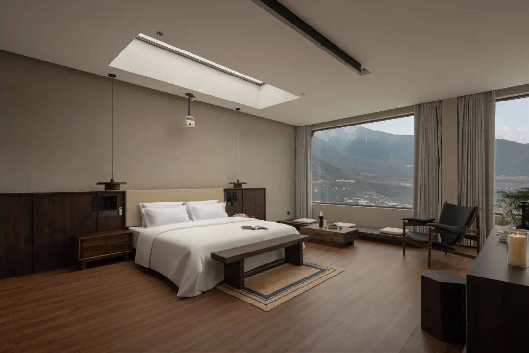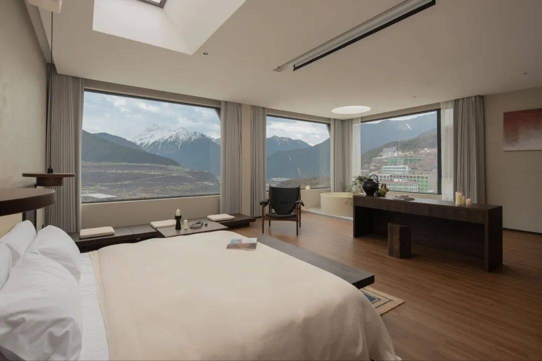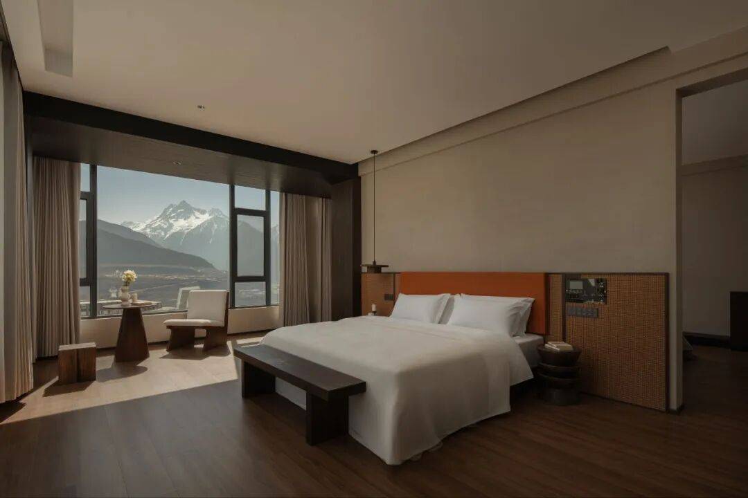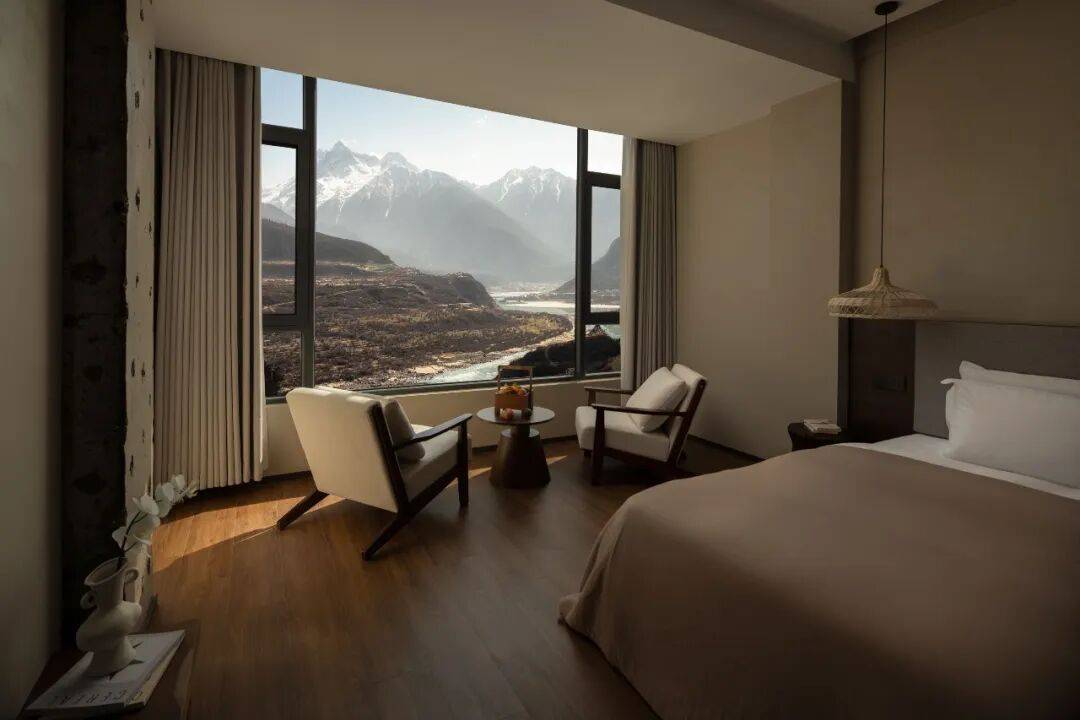 客房设计遵循“极简留白,视线聚焦”的原则。房型以江景和山景大床房为主,设计团队刻意减少了房间内部的装饰语言,大面积留白,目的是将人的视线引导至窗外。在窗台处理上,采用碳化木作为“框景”的材料,仿佛为窗外的南迦巴瓦或雅鲁藏布江定制了一个天然的画框。