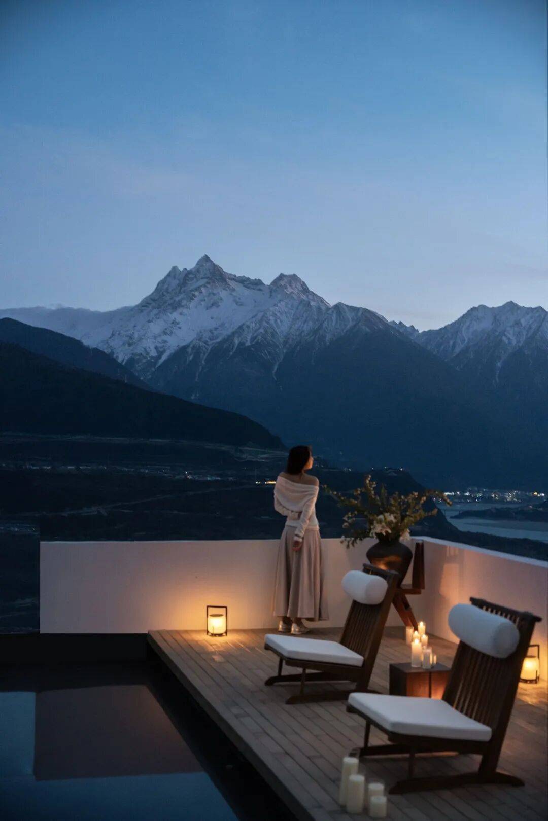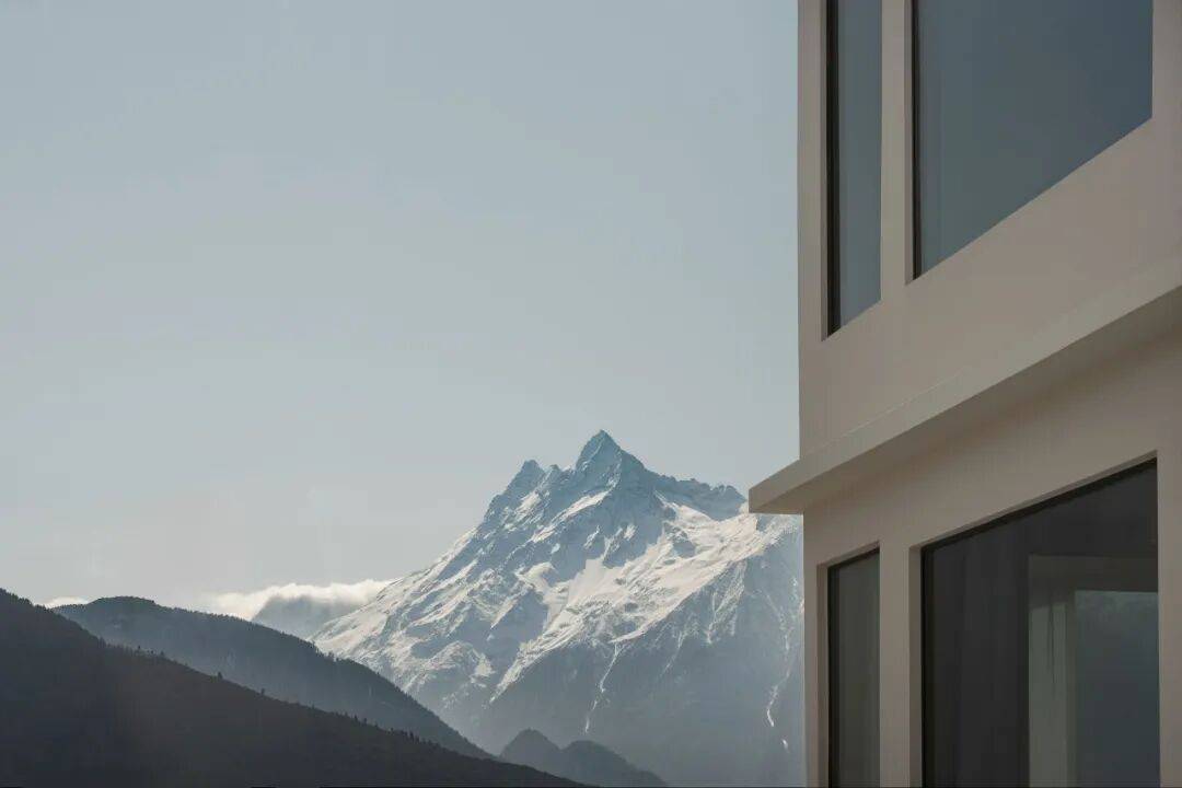 改造策略不是推翻,而是织补与重构。为了形成连贯的度假体验,设计团队通过钢结构过道将两栋建筑连接,使之成为一个完整的有机体。西侧建筑加盖一层,打造为特色景观套房;而东侧屋顶则被改造为整个索松村观赏南迦巴瓦的最佳公共平台。在这里,设置了一处浅水面的镜面水池,雪山圣洁的倒影映于水面,玻璃栏杆与保留的矮墙形成微妙的安全感与视线渗透,创造了一种“手可摘星辰”的独特体验。