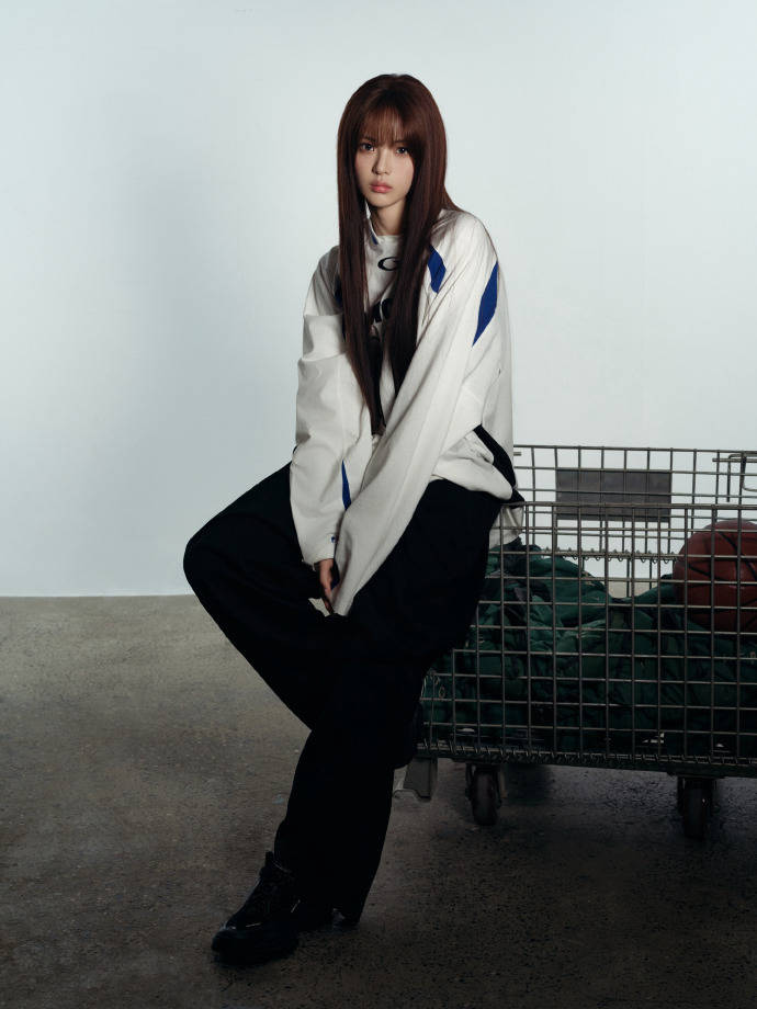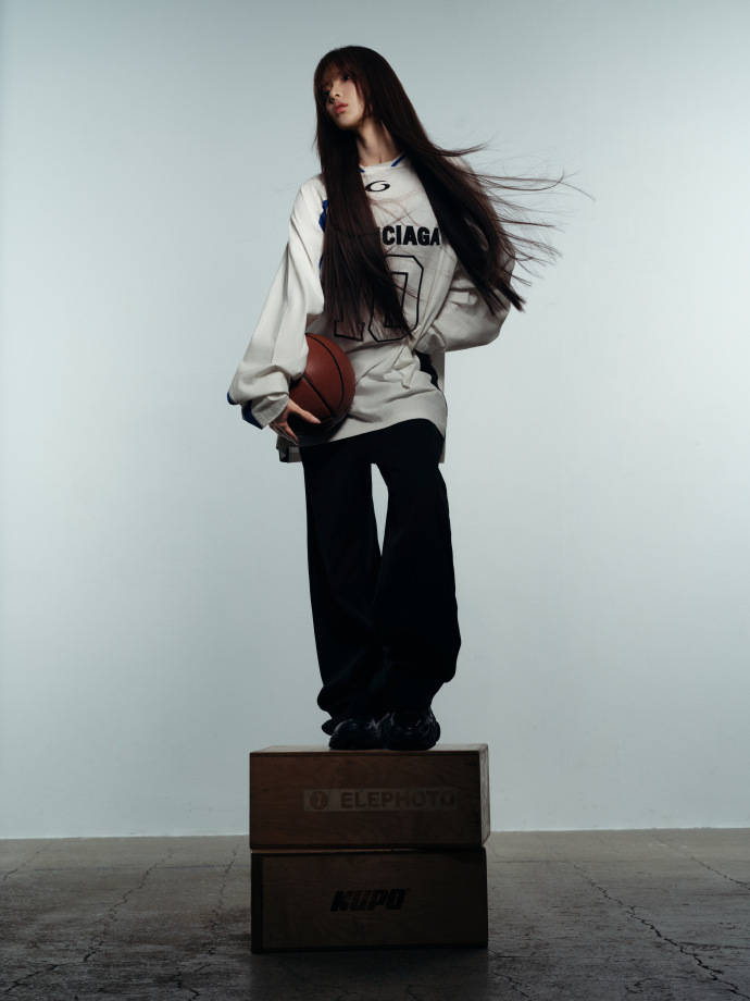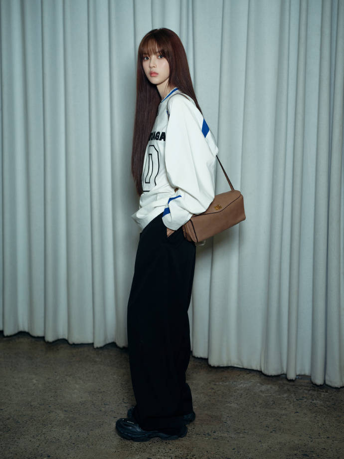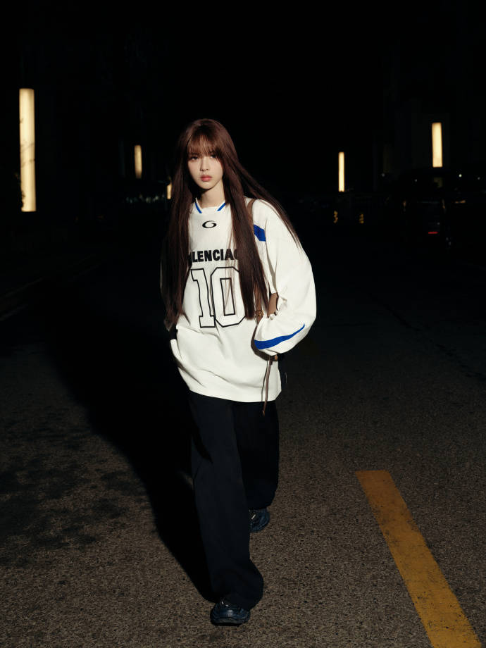 上身白色长袖球衣是整套 look 的核心亮点,oversized 版型慵懒随性,利落的蓝白撞色线条点缀衣身,既保留了运动风的活力感,又不会显得过于休闲。胸前的数字与字母印花,为整体注入了街头潮流基因,宽松袖管恰好藏住手臂线条,衬得身形愈发纤细轻盈,随性中透着不经意的时髦。