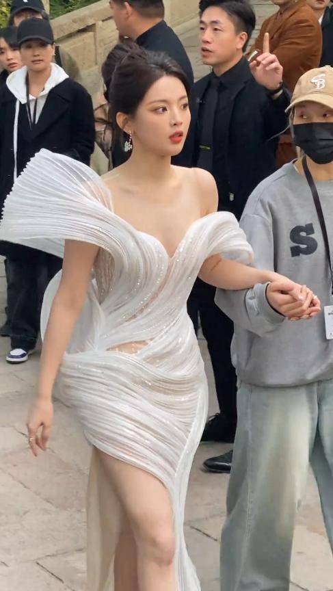 还有GQ盛典上的云绸闪钻鱼尾裙,把她的身材优势发挥得淋漓尽致,行走间像自带光芒,连时尚博主都夸她穿出了高级感。