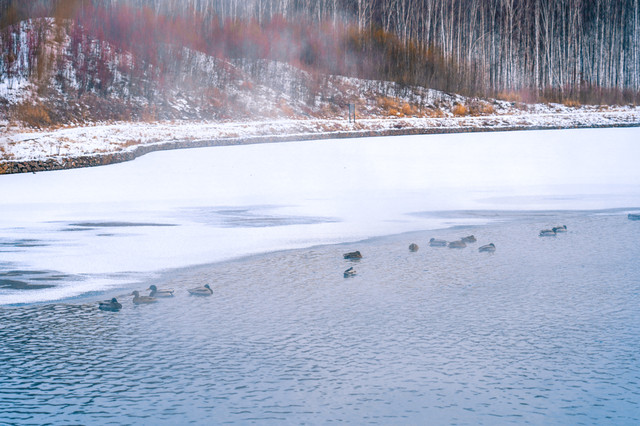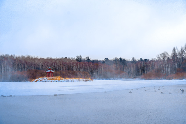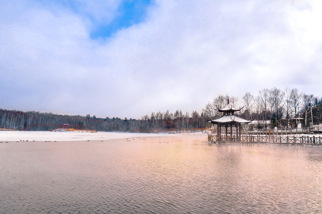 视觉震撼:碧泉湖由多处温泉群汇集而成,冬日里湖面热气腾腾,湖岸雾凇满挂,宛如仙境。