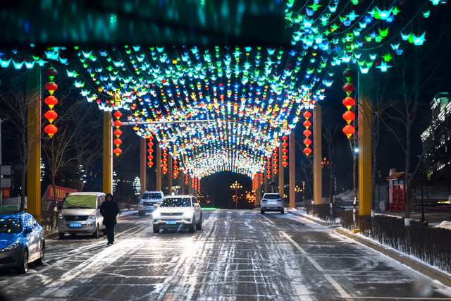途径长白山下第一镇“二道白河镇”,这里的标志性网红夜景打卡点梦幻至极,能暖化每一个游客的心。