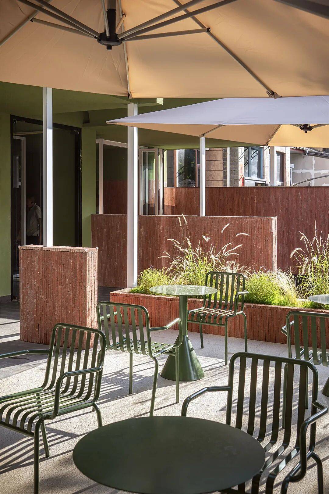红色条石砌筑而成的片墙,作为核心设计语言,重新定义了区域间的柔性边界。从相对私密的独立茶座,到半开放的接待过渡区,再到完全面向庭院的外摆区,空间分区清晰而边界交融。墙体如同空间叙事的“导演”,不动声色地引导着视线流动与步伐转换,营造出“步移景异”的动态体验。