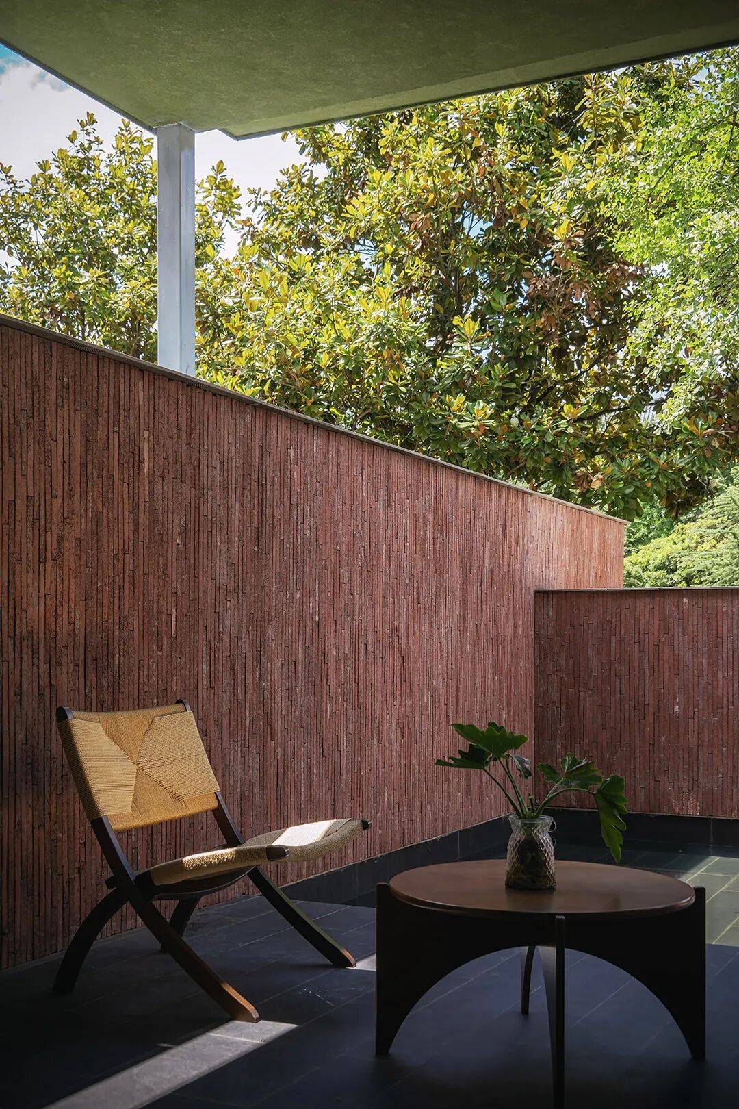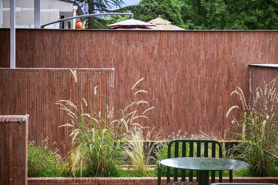 室内外片墙使用定制的红色半手工条石,是我们反复调试颜色后得到的惊喜:它是混凝土半手工压制而成,用天然矿物提取颜色,成本可控还自带自然手工质感,室内外可以连贯使用;施工也不需要刻意对缝,自然长短错落的拼接反而更有手工氛围,轻松跳出平庸感。