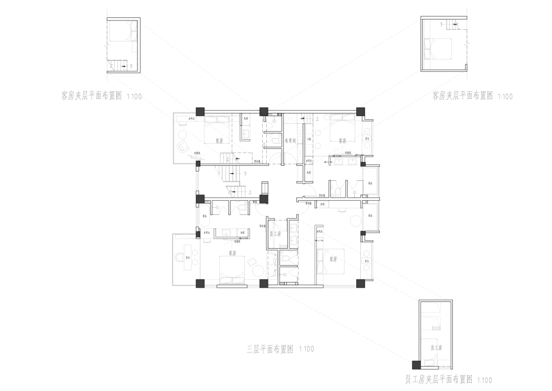 依托结构调整房型:三层原有结构自带阁楼条件,我们保留2个房间的阁楼属性,做为亲子/家庭套房;另外2间则将空间归还给客房,形成更开阔的平层空间,以匹配不同客群的偏好。
