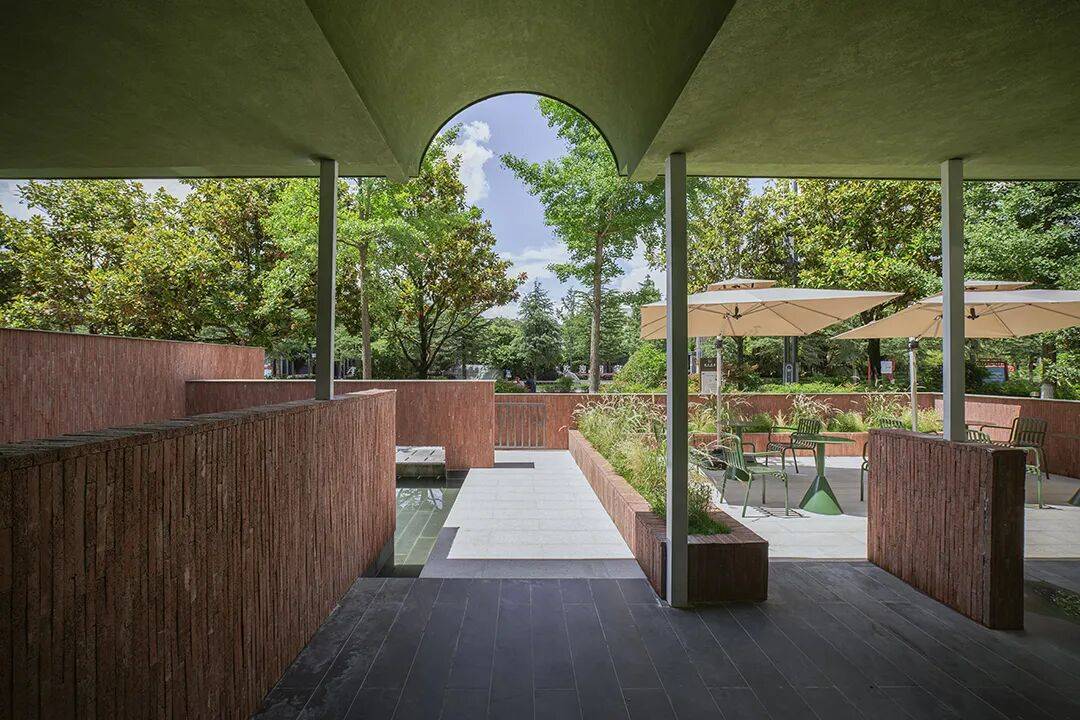 矮墙的“导演”作用:红色条石砌筑的矮墙既划分空间(如茶室、接待区、外摆区),又通过框景、透景引导视线流动,实现“步移景异”。