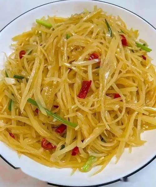 3. 加入土豆丝翻炒,加入醋、生抽、盐、白糖调味,翻炒均匀即可出锅。