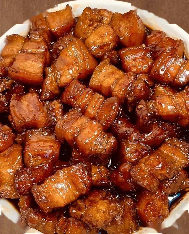 3. 加入五花肉块翻炒,让每块肉都裹上糖色。