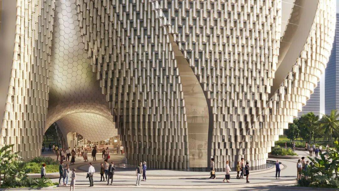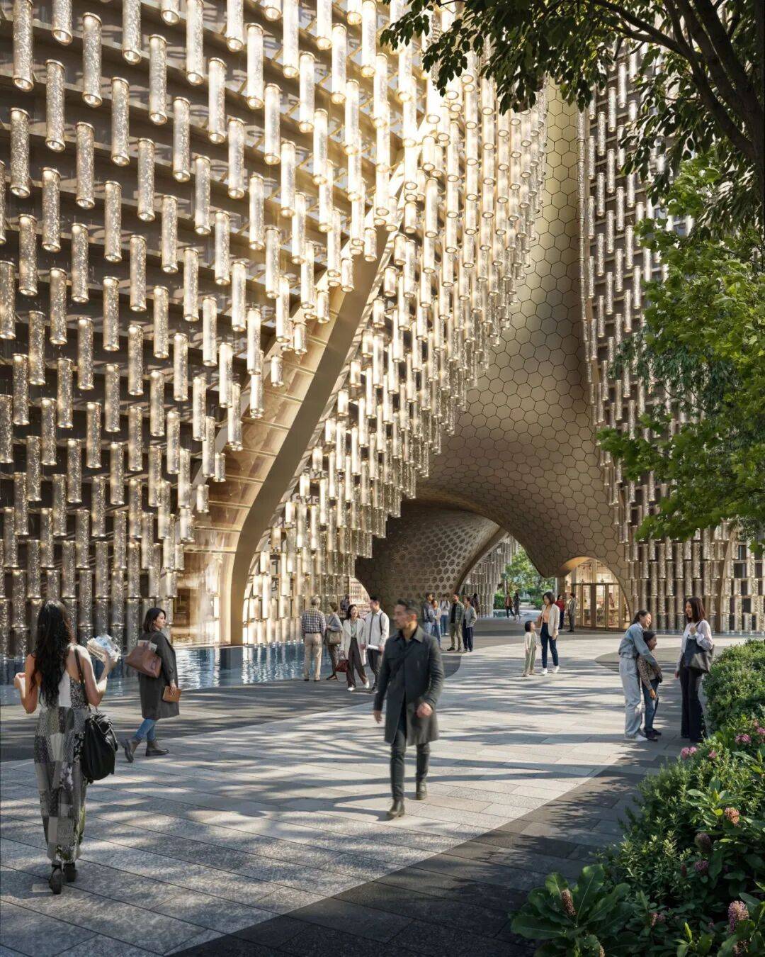 策略:以“共生”为核心理念,通过五个雕塑感亭阁结构抬升展览空间,释放地面公共广场;立面采用参数化设计的悬挂式玻璃管系统,形成半透明“窗纱”,既遮阳又引入自然光。