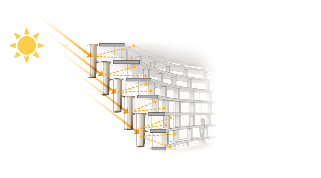 如同树木的枝叶,这些玻璃管为建筑提供遮阳、光线漫射与通风效果,显著提升建筑的能效,同时将柔和的自然光引入室内空间。锥形体量的屋顶可收集雨水,经处理后汇入地面蓄水池循环利用,呼应深圳“