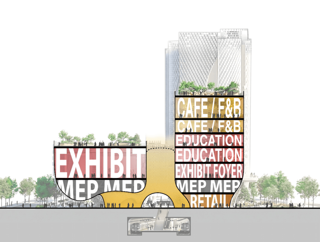 融美术馆直接接入后海综合园区,并与周边城市的多层级立体交通网络连接。多层联桥将美术馆与其他塔楼以及深圳人才公园相连,同时,地铁站的连接也被整合进整体开发之中,使访客能够从地下直接抵达文化广场。