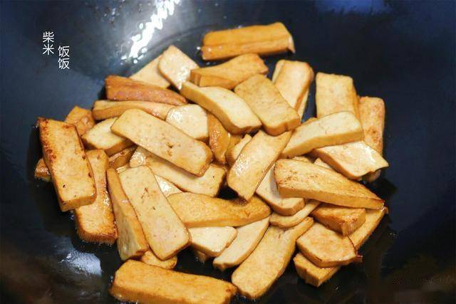 7,热锅凉油,倒入香干,大火炒到表面微焦。