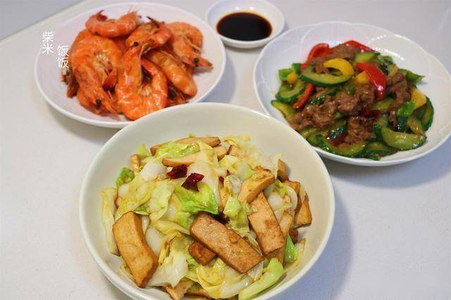 午餐:黄瓜炒牛肉、包菜炒香干、白灼虾