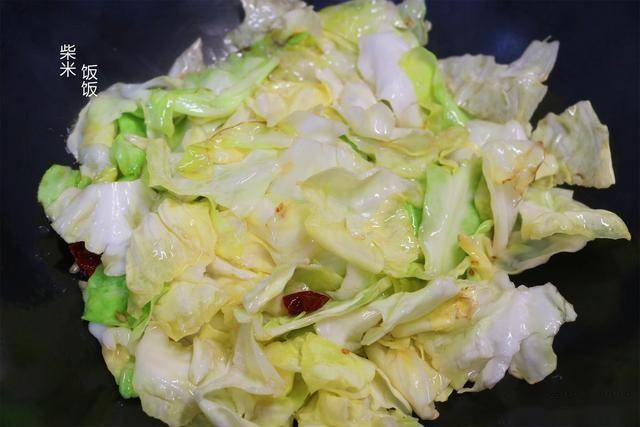 10,放入包菜,大火快速炒软。