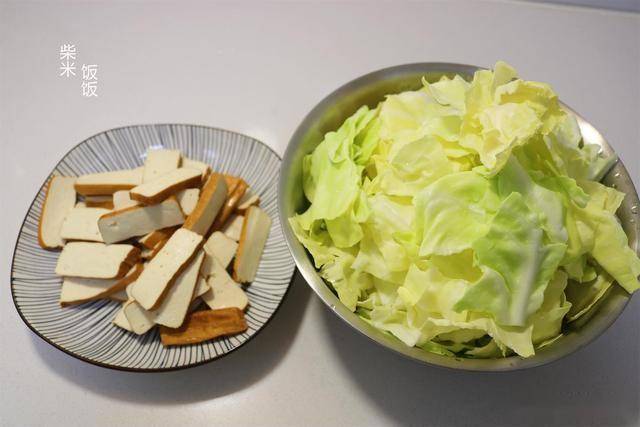 6,包菜炒香干做法:攸县香干切片,包菜洗净,撕成小块。