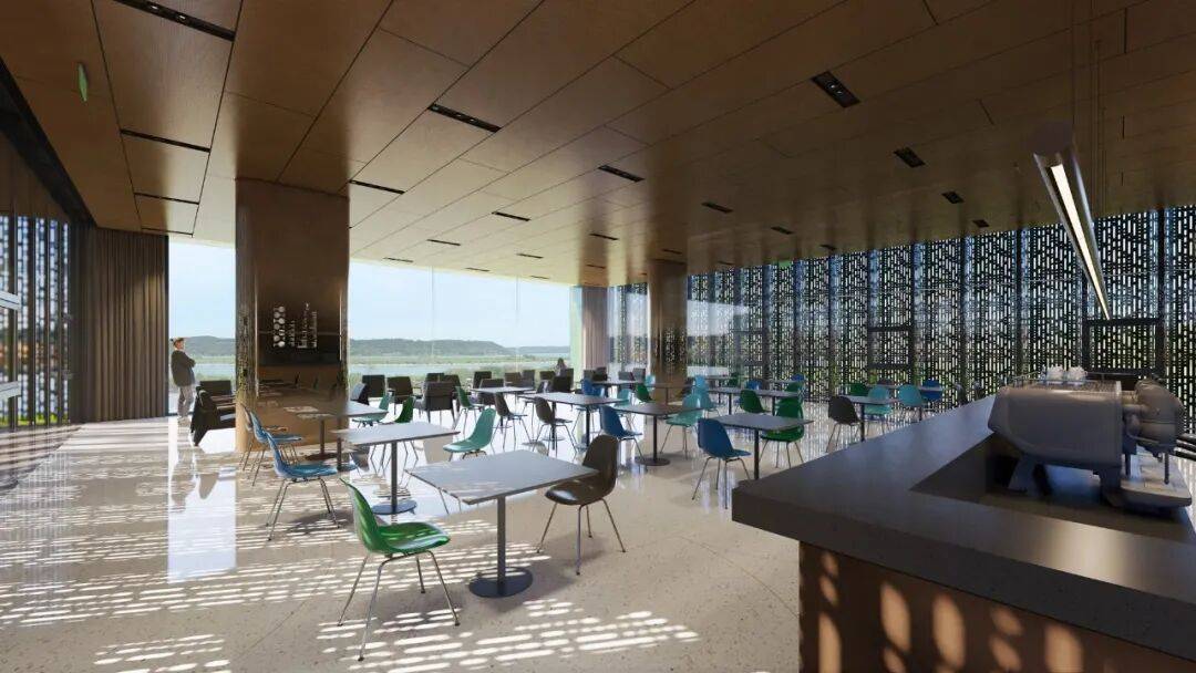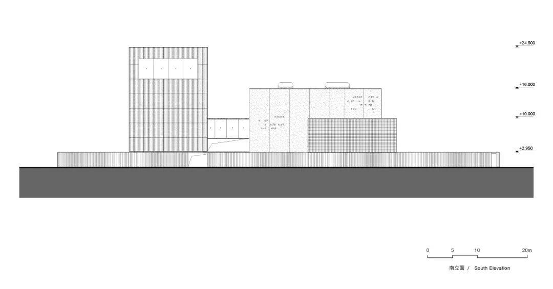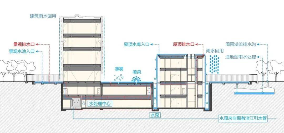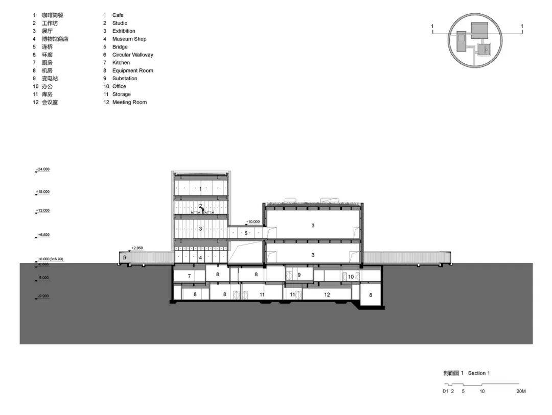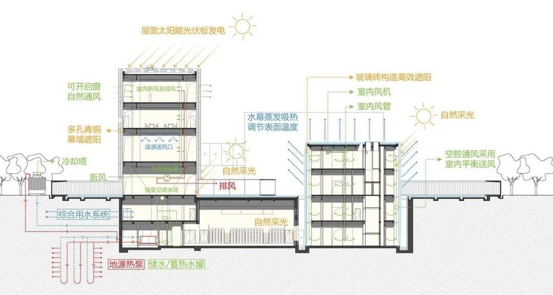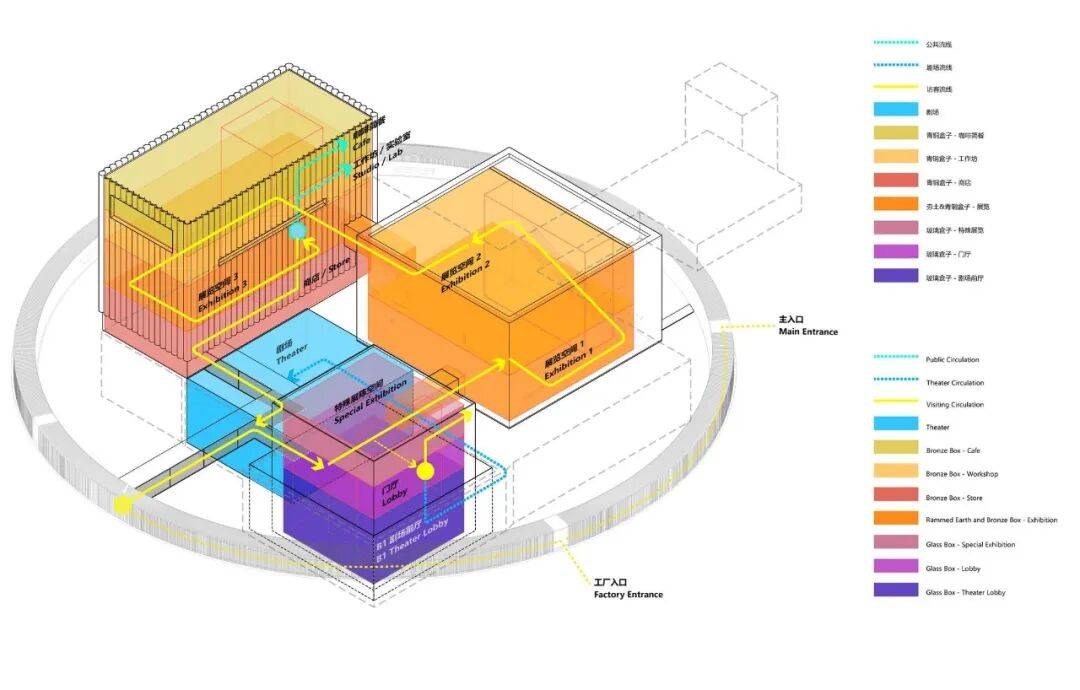 三个漂浮的盒子容纳了入口门厅、展览空间、工作坊、餐厅及体验商店等主要公共功能。水面之下,建筑空间为完整一体,包括多功能小剧场、排练厅、水吧、办公及后勤等完备功能,为观者提供更多维度的丰富体验,以连续空间的包容性成就了地上的纯净和诗意。博物馆在设计上整合了被动式与主动式的节能策略,构建低碳且具韧性的环保节能建筑体系。地源热泵系统和水蓄冷及蓄热系统同时运用,减少运行费用;青铜盒子屋顶设置太阳能光伏发电系统;生活热水采用空气源热泵及太阳能板,新风系统利用热回收;项目建立水循环系统,收集和再利用雨水,并采用酒厂生产中引流的涪江江水用于水池景观,充分利用场地内及周边既有的基础设施和资源。