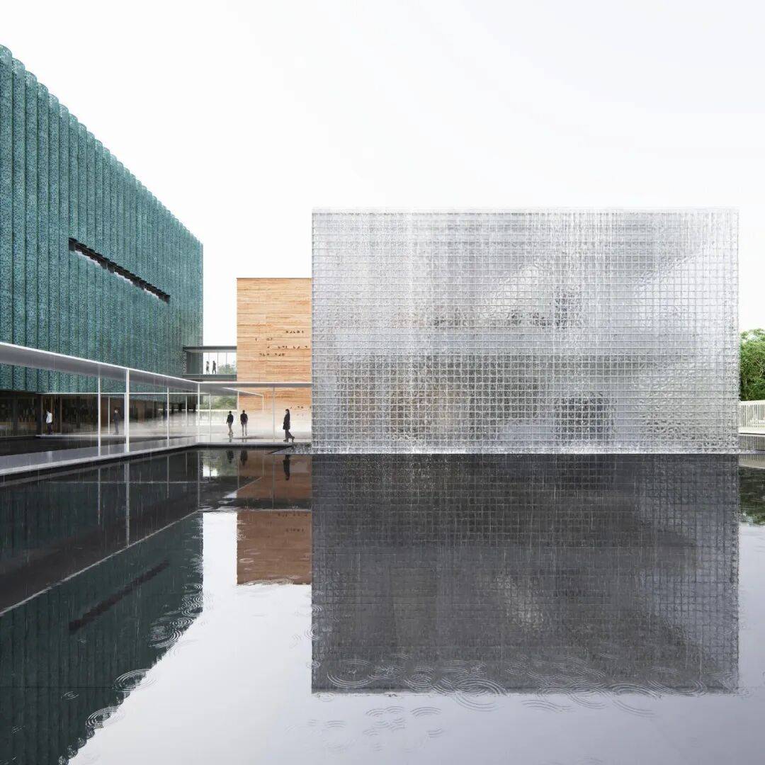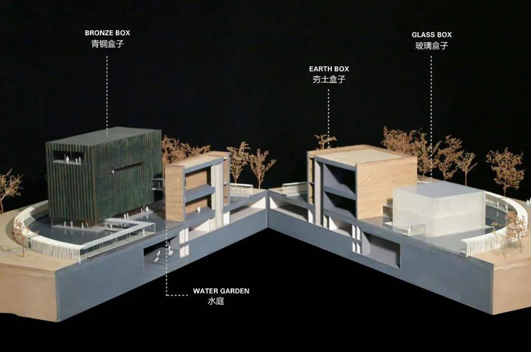 水中浮出三个看似独立的建筑体量——青铜、夯土和玻璃盒子,分别与水面有着不同的关系。三个体量和水景穿插交叠,创造出独特的博物馆游历体验。观展者在建筑的“山”和景观的“水”之间交替进行,时而在沉浸式的暗空间里,时而从丰富和变化的水景中穿过,在虚实和明暗的不断变化中,体会与自然环境、时间循环以及诗酒文化的深层关联。这里的设计灵感来自于中国古典园林中“一池三山”的造园理法,用宽阔的水体和水中岛屿映射出上古神话中仙境的意向,与中国传统诗酒文化中的飘然欲仙息息相通。