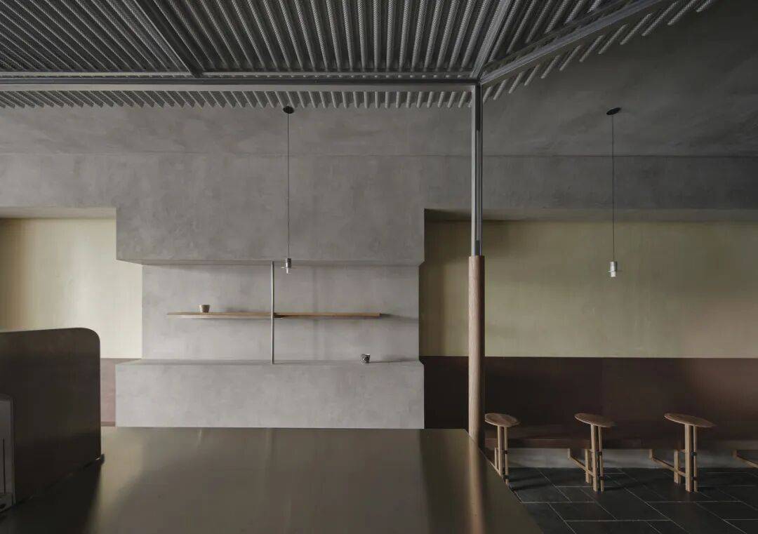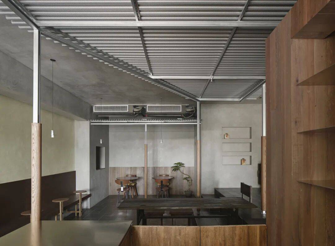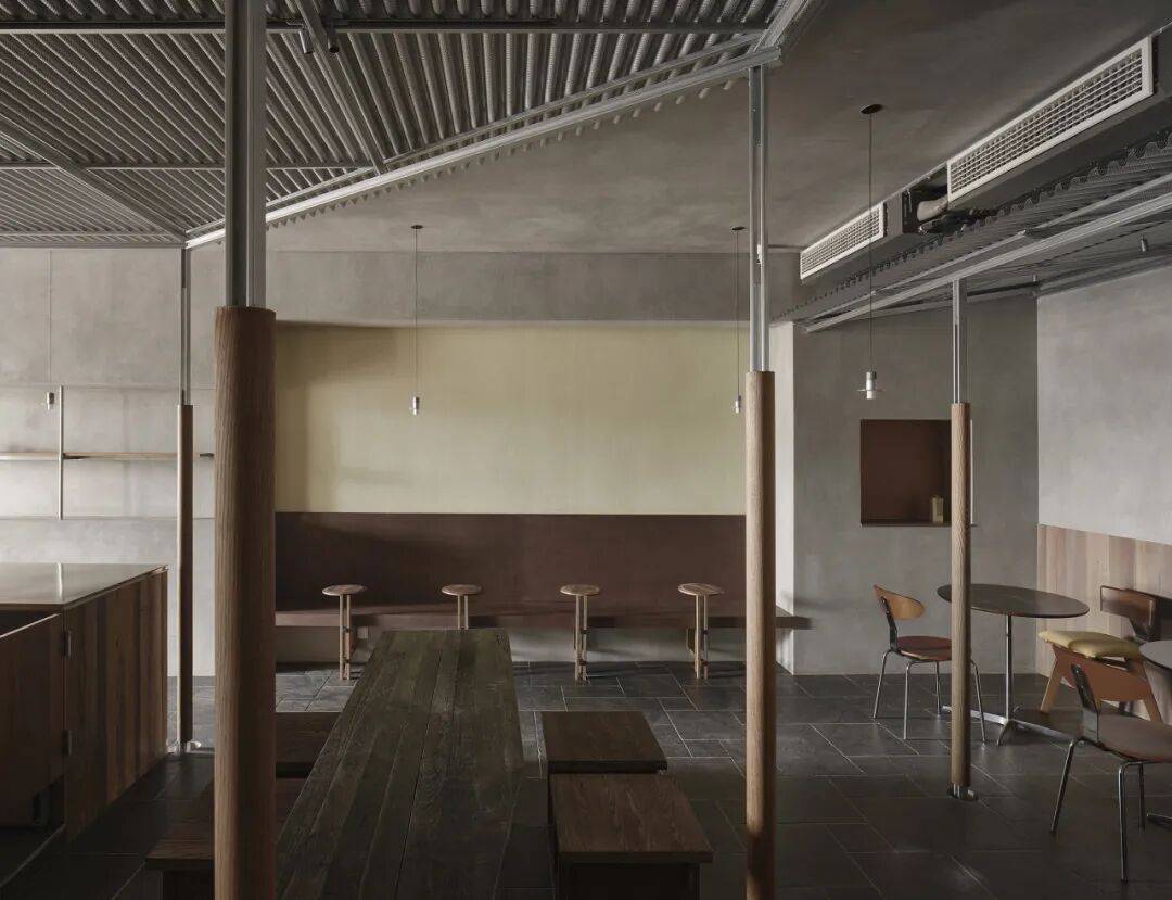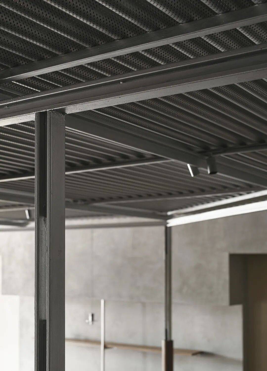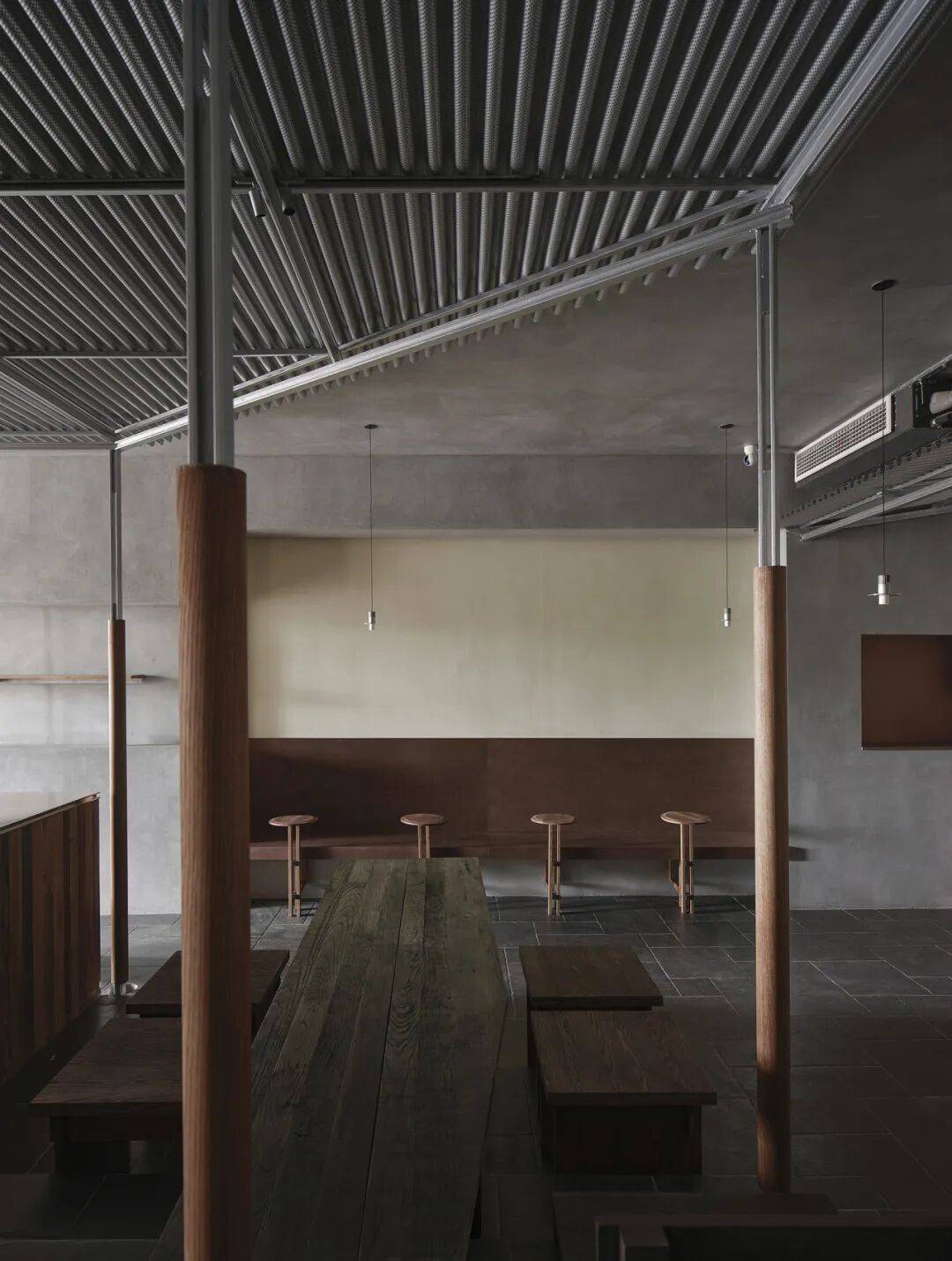 雨棚是南京老城区街头随处可见的临建元素,设计师选取雨棚形象作为设计元素,建立室内与街巷的联结。室内有两处雨棚,一处是吧台区,是咖啡店公园感的核心要素;一处是在双人座位区,单坡雨棚划定相对私密区域,檐下立柱强化空间构造秩序。“雨棚”的屋面采用波浪形冲孔铝板,提升透光性和空气流动性,稀释厚重感,使空间氛围更加当代。雨棚的细柱采用钢木结合建造方式,在柱础和柱梁交接位置,扁钢与木杆拟态燕尾榫,将传统木构节点形式转译并使用在工业材料上,形成独特有趣的现代语汇。木构形式也被运用到家具节点上作视觉点缀,如卡座旁的小圆桌和定制长桌,在保持家具整体利落干净形态的同时增加意趣。