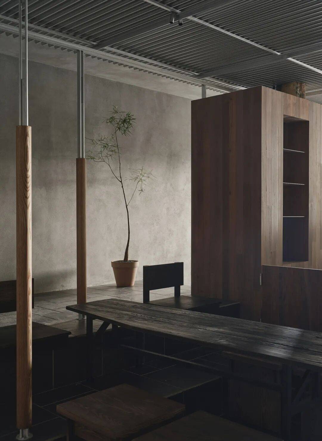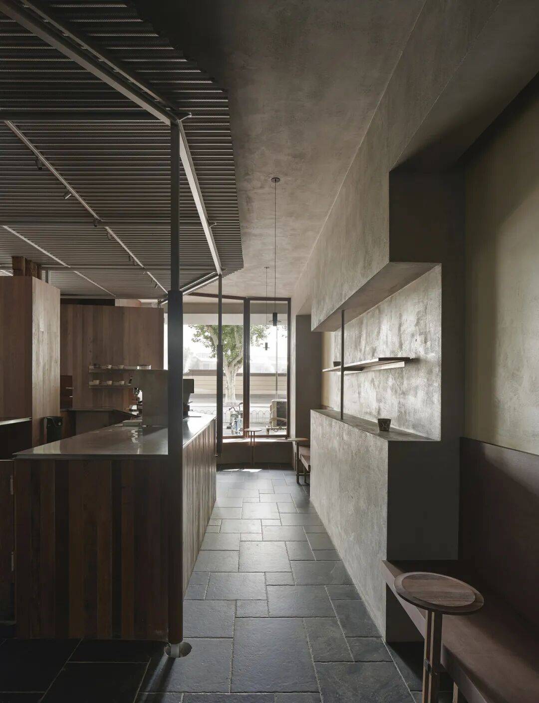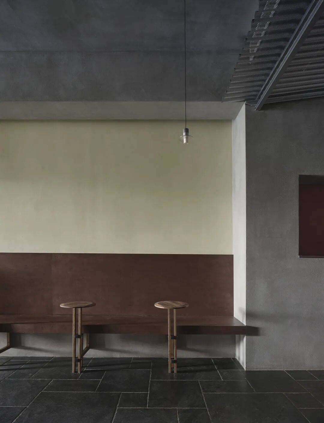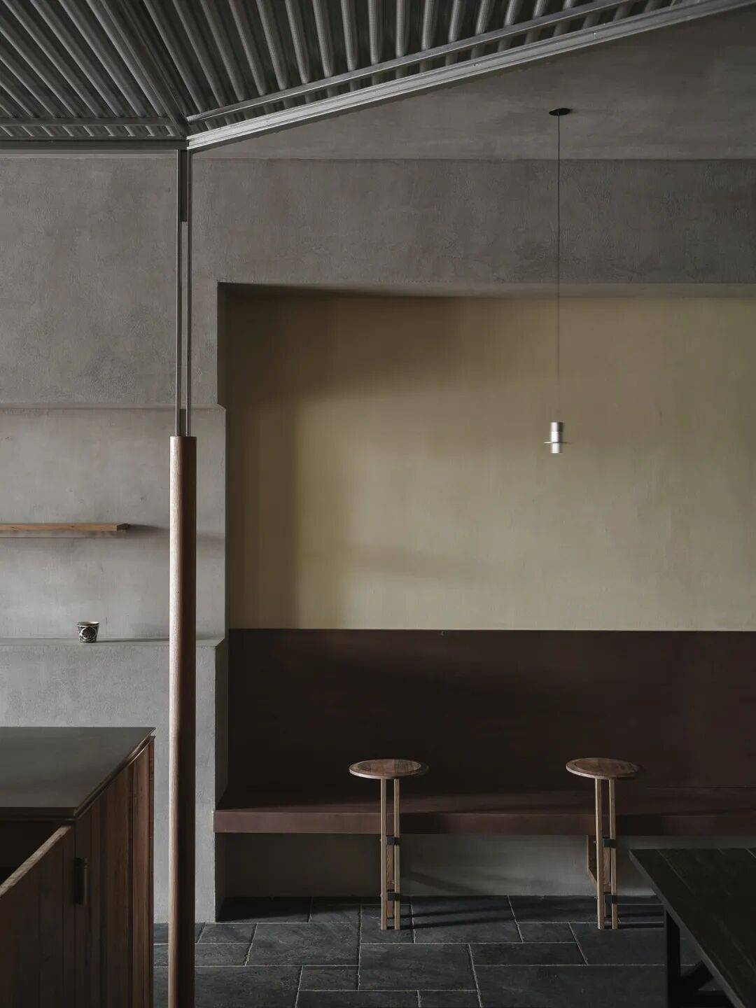 雨棚是南京老城区街头随处可见的临建元素,设计师选取雨棚形象作为设计元素,建立室内与街巷的联结。室内有两处雨棚,一处是吧台区,是咖啡店公园感的核心要素;一处是在双人座位区,单坡雨棚划定相对私密区域,檐下立柱强化空间构造秩序。“雨棚”的屋面采用波浪形冲孔铝板,提升透光性和空气流动性,稀释厚重感,使空间氛围更加当代。雨棚的细柱采用钢木结合建造方式,在柱础和柱梁交接位置,扁钢与木杆拟态燕尾榫,将传统木构节点形式转译并使用在工业材料上,形成独特有趣的现代语汇。木构形式也被运用到家具节点上作视觉点缀,如卡座旁的小圆桌和定制长桌,在保持家具整体利落干净形态的同时增加意趣。